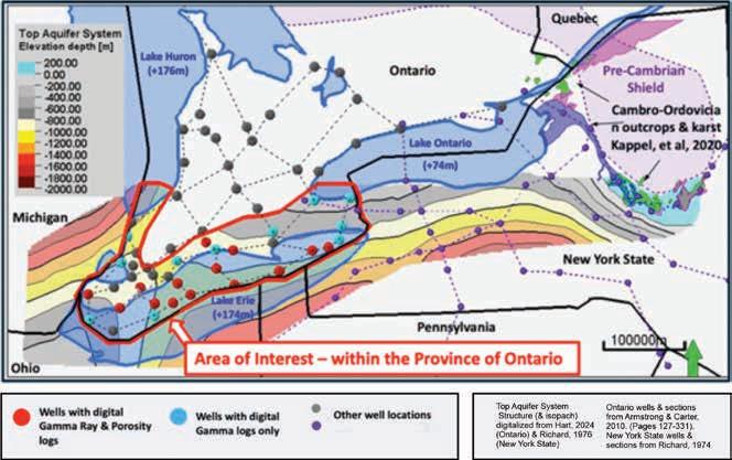 exhibits low natural seismicity and no major fault systems (Shafeen et al., 2004), although pressure-induced seismicity remained a potential risk in the confined (COSS). They further emphasised that multiple injection wells improve pressure distribution, monitoring capability, and risk mitigations (Bump and Hovorka, 2024). Due to the great age of the hydrogeological system and the presence of highly saline brines, they considered that the risk of potable groundwater contamination is low. However, offshore injection beneath Lake Erie introduces additional transport and storage risks.
