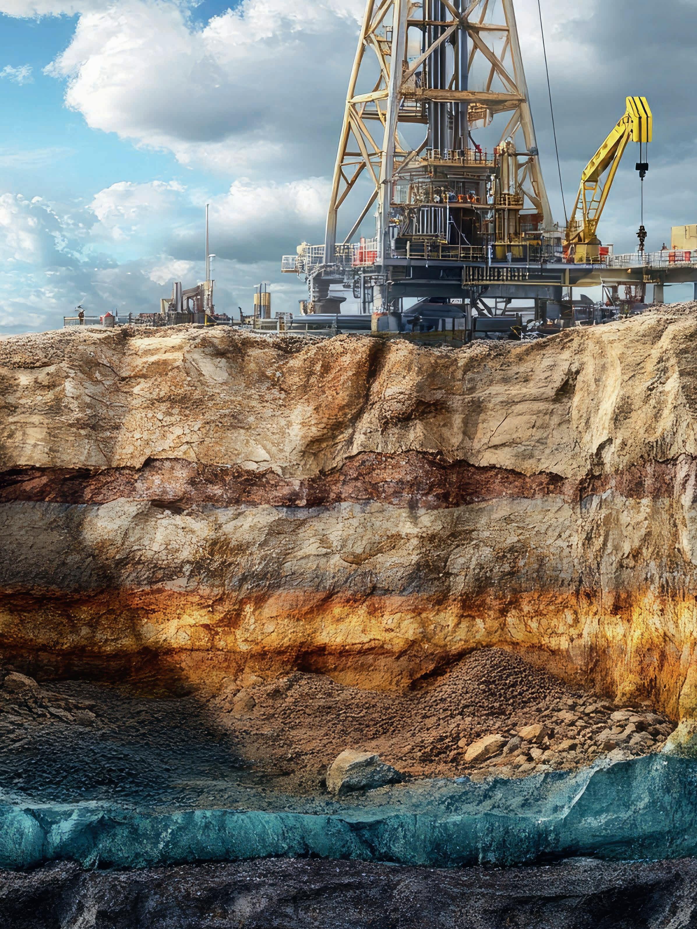 cover: A cross-section of geological layers is exposed as a drill reaches the oil reservoir.