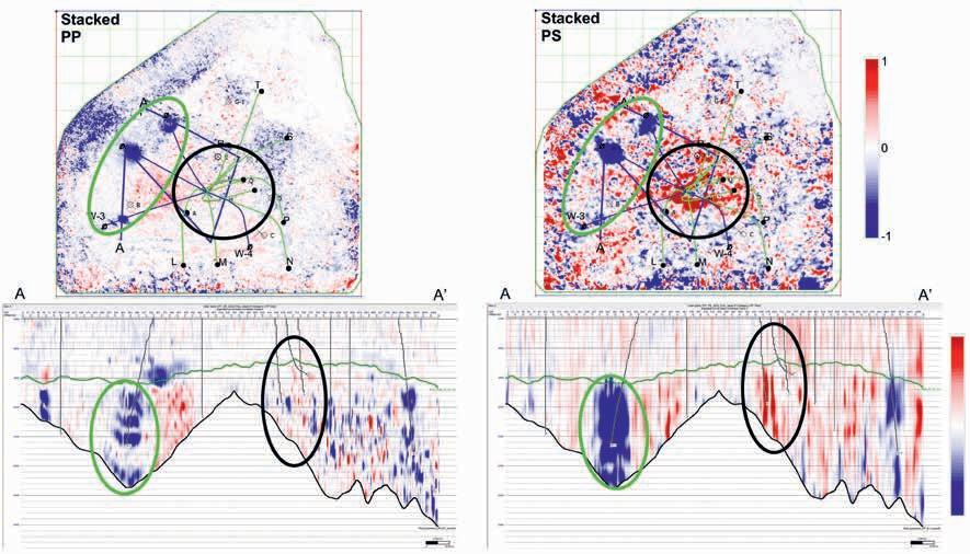 time-shift decrease (softening in blue) is seen at the injectors W-1, W-2 and W-3 both on the PP and the PS time-shifts as indicated by the green circles in map view and section view along A to A’. Note that the pressure changes at the injectors are much clearer on the PS time-shifts versus the PP time-shifts in the cross sections, indicating higher sensitivity of PS data to pressure. Around the producers, the PS time-shifts show clearly a pressure decrease (time-shift increase in red) in the shape of a horseshoe (see black circle on PS time-shift map view). In this area there is minimal pressure drop in the order of 6 bars. The time-shift increase in red can also be clearly seen along the A to A’ cross section (black circle at the producer). It is important to note that since density is not sensitive to pressure changes, around the producers with no saturation change, the shear impedance is a direct indicator of pressure changes (through the sensitivity of the shear modulus to pressure changes).