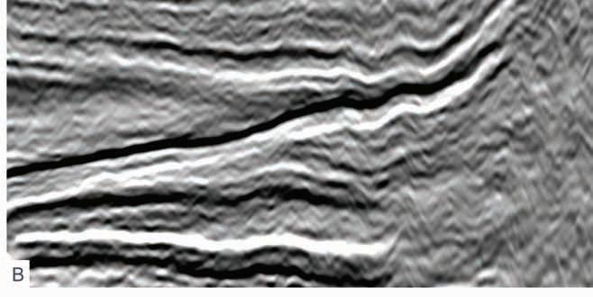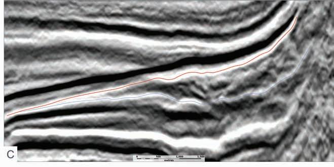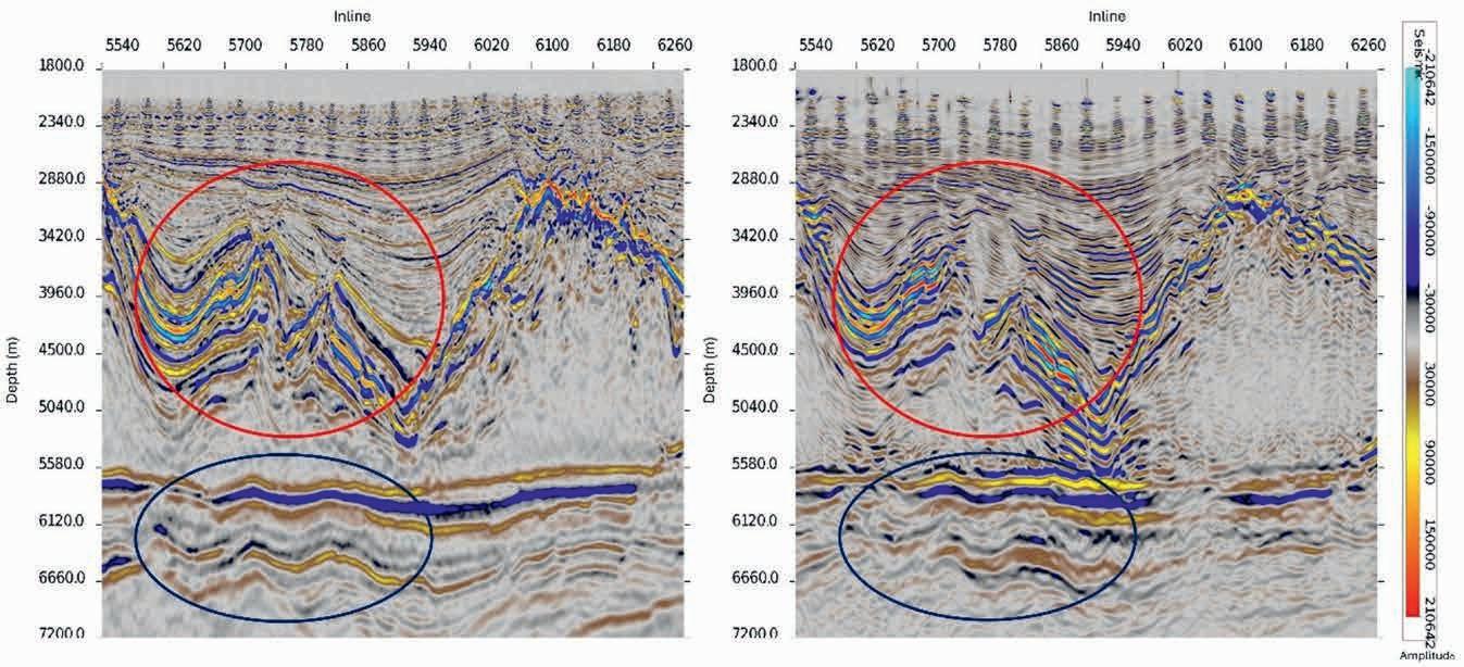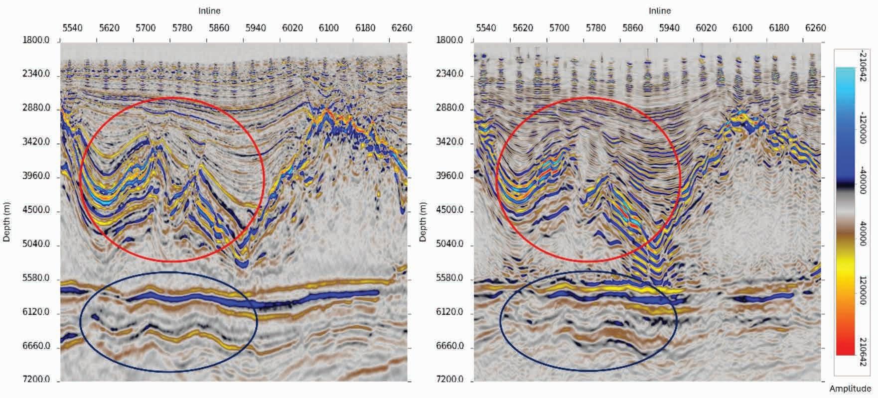 other large impedance contrasts cannot be properly imaged by the Kirchhoff algorithm. On the other hand, the implementation of RTM for PS data requires appropriate handling of low velocities (less than 300 m/s) found in the sedimentary section near the seafloor, since the need for very fine propagation grids becomes a computational issue. In Figure 13 we have a PP upgoing section and the corresponding PS section after migration using a Kirchhoff algorithm from the offshore Brazil field discussed earlier. In the region of the red circle, there is a good correlation between the events in both sections, including the faults. In the blue circle, there is a strong and coherent signal in the PS section, with structures that are consistent with the PP image. However, the salt flank is not properly imaged.