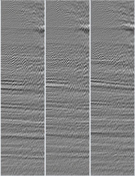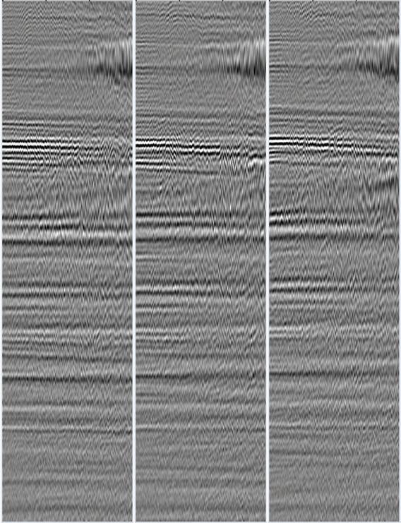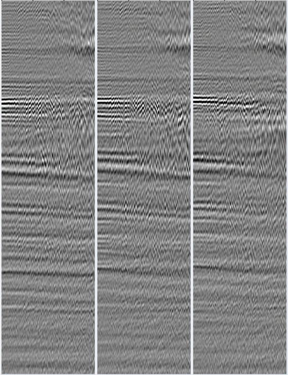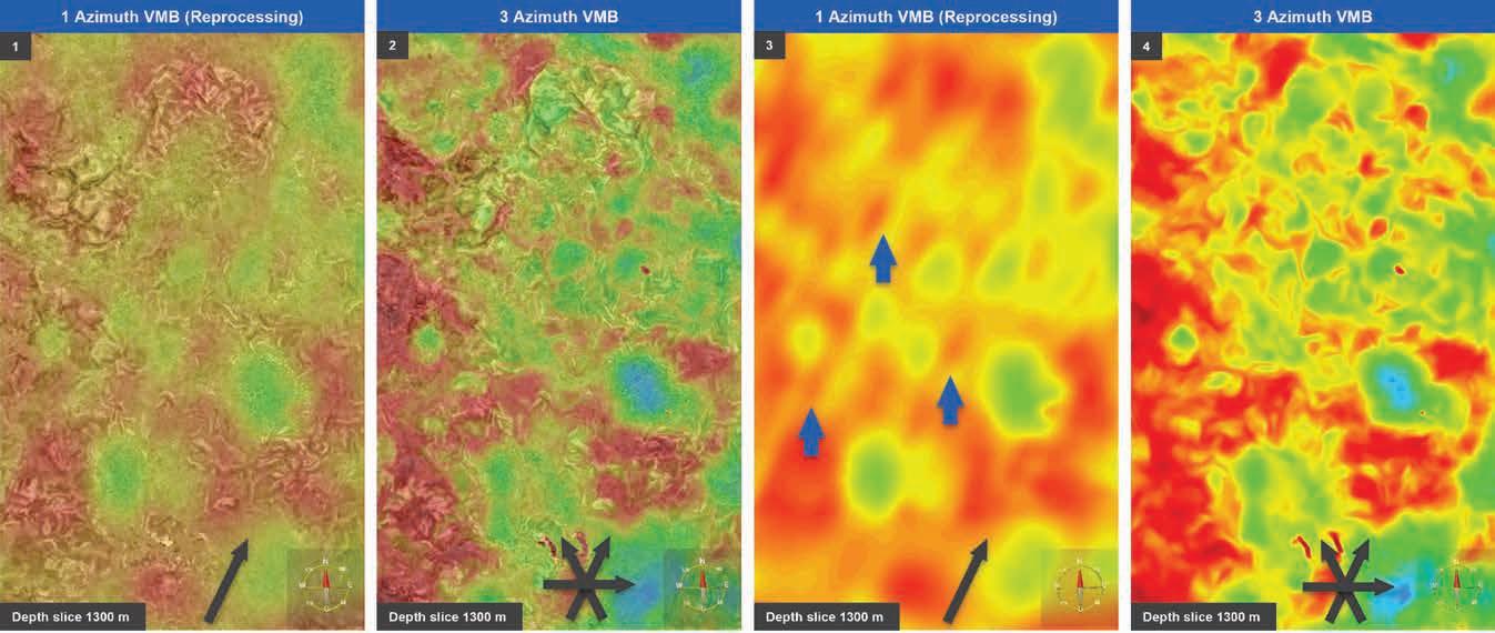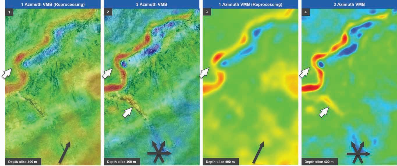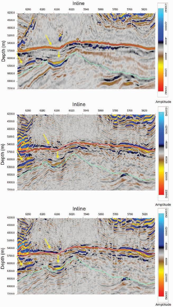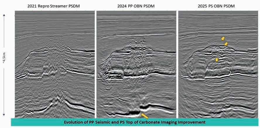 Figure 9 Pre-stack depth migration imaging improvements with PS data: 2021 streamer PP image (left), 2024 OBN PP image (middle), and 2025 OBN PS image (right). Improvement in imaging target zones with PS data are indicated by yellow arrows.