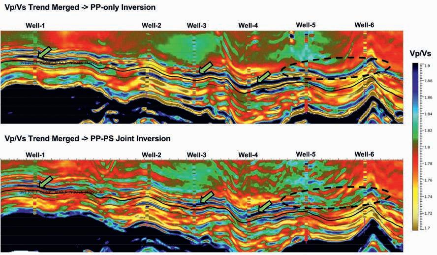 Figure 5 The comparison of Vp/Vs ratio volumes between PP-only (top) and joint PP-PS (bottom) inversions emphasises the benefits of the joint inversion, with green arrows marking areas of improved well fit, better matching the log amplitudes. The black dashed ellipse highlights a basal anhydrite interval at the base of the evaporite sampled in well 6 but not in well 5. The conventional PP-only inversion incorrectly suggests basal anhydrite in both wells, whereas the joint inversion accurately identifies it only in well 6 due to its enhanced stability.