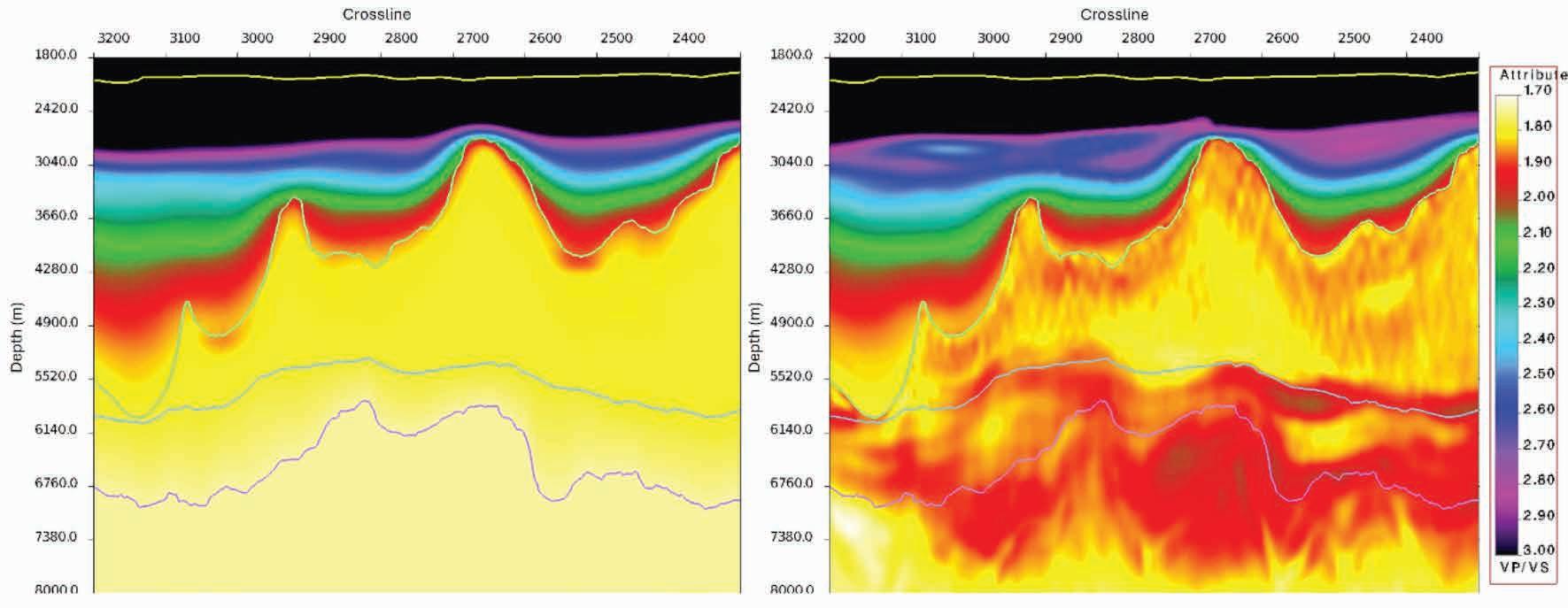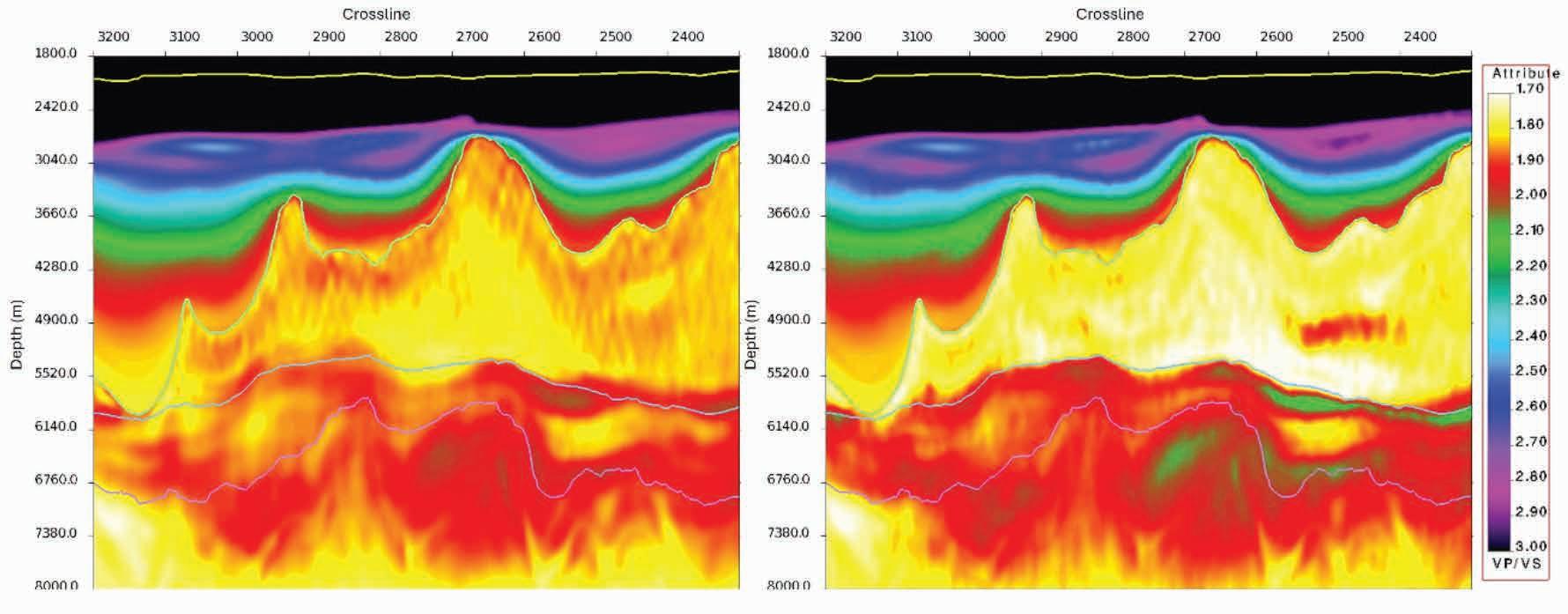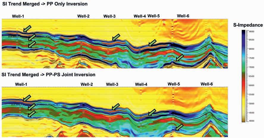 Figure 9 where the value of PS imaging within complex structures for accurate seismic interpretation, well optimisation, and static/ dynamic reservoir modelling can be clearly seen below the shallow gas zone (yellow arrows on right side of figure). PP and joint PP-PS inversion is applied to the PSDM data and results are shown in Figure 10. Given the high quality of the PS data, pre-stack PP-PS simultaneous inversion is seen to significantly enhance reservoir characterisation in this shallow gas-affected field compared to conventional PP inversion. Key workflow adaptations, such as event registration optimisation, well-to-seismic calibration, and