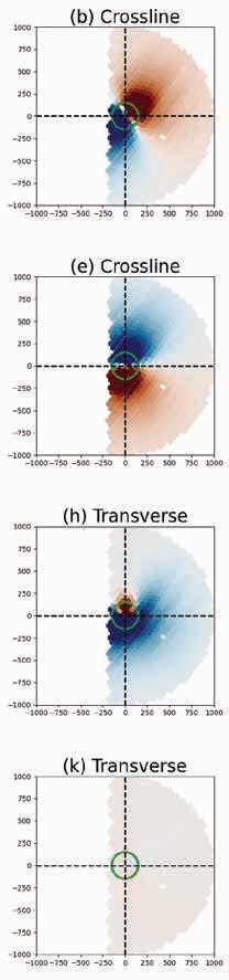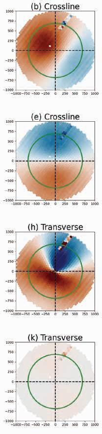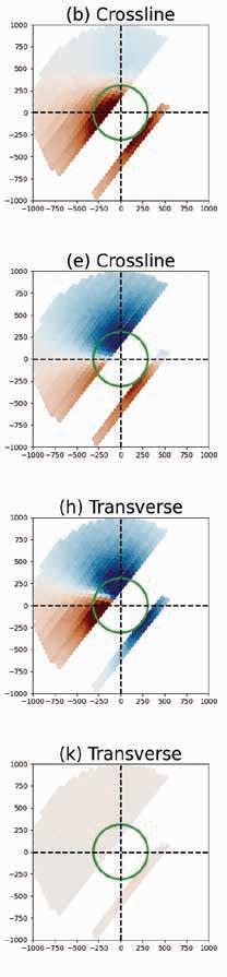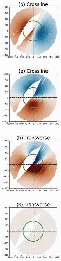 depletion) and repeated in 2022. For both acquisitions we have 200 m cable spacing with 25 m receiver spacing and source spacing of 25 m along the cable direction and 50 m crossline. The results of the AVO inversion are shown in Figure 6 for PP data and for joint inversion of PP and PS data (see Tura et al., 2024, on the method used to get to these results). The horizontal axis is 4D changes in Ip and the vertical axis is 4D changes in Is from AVO inversion. The different coloured data points are taken from regions in the field where pure pressure and saturation changes are expected. In these applications, we expect the fluid-related changes to be close to the horizontal axes (no shear modulus change) and pressure changes to be more along the diagonal (shear modulus change). As can be clearly seen, the improvements in the Is with the joint inversion has moved the data points to the correct or expected locations. For example, the yellow gas (fluid) changes and dark-blue water replacing oil (fluid) changes are 7 degrees from the 4D Ip axes. Also, injection and depletion pure pressure points have moved towards the diagonal at 70 degrees for this field (meaning Is is more sensitive to pressure then Ip.).
