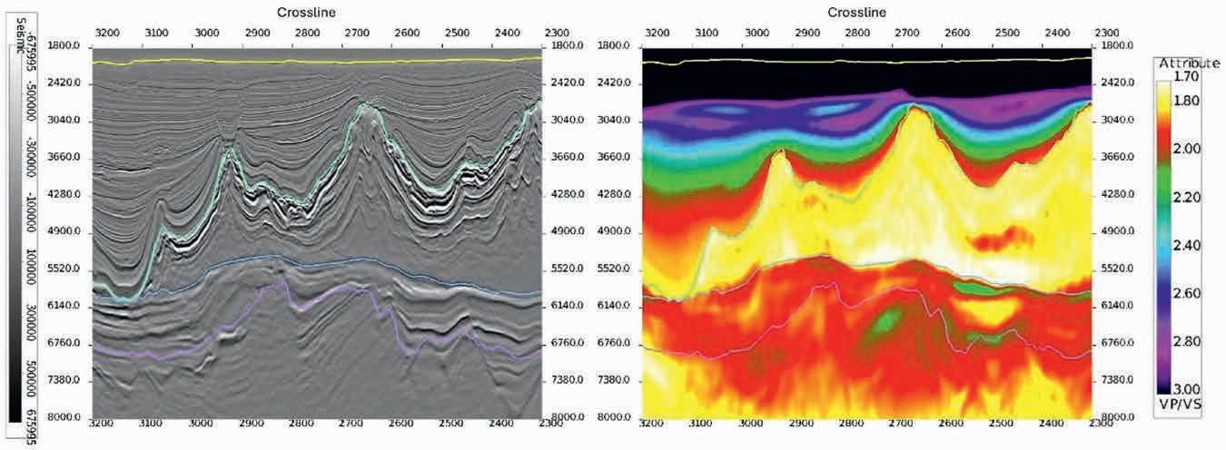 correlation with PP data, so that it can be used as input for joint PP-PS elastic inversions. Furthermore, from Vp and Vs volumes, it is possible to calculate and interpret elastic parameters such as the Poisson´s ratio and Vp/Vs ratio. This is shown in Figure 12 from the offshore field in Brazil discussed earlier.