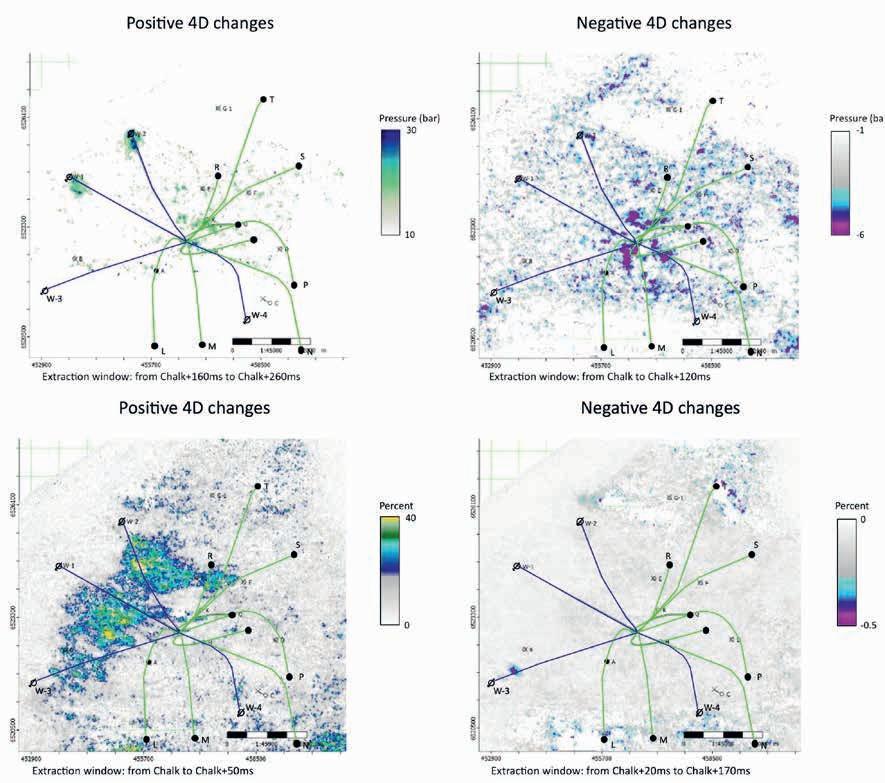 DHI and 4D interpretation. In fact, with these more quantitative results, we can now convert seismic impedances to reservoir engineering fluid changes (in per cent) and pressure changes (in bars) as shown in Figure 7. Here, pressure increase is strongest at injectors W-1 and W-2 estimated at around 30 bars, pressure decrease is strongest at the producers under the platform with a small amount estimated at 6 bars, water saturation increase shows progression of the water front with an estimate of 40% saturation change or sweep efficiency, and gas saturation increase shows an area of gas injection near well W-3 at 0.5%.