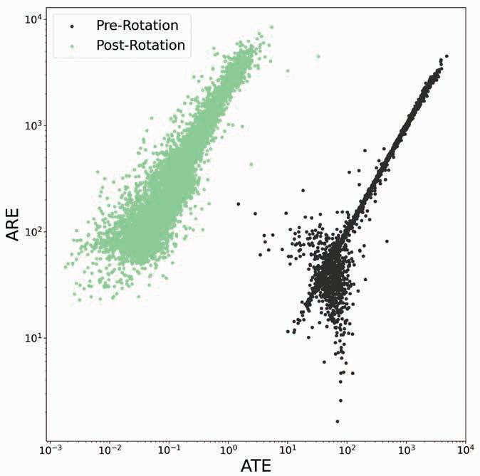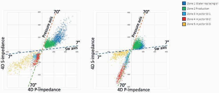 Figure 6 4D P- and S-impedance inversion with PP pre-stack data (left) and joint PP+PS pre-stack data (right). Green dots are from the region around producers with pressure decrease (hardening), dark-blue dots are from region around water-front (hardening), red dots are from the water injector W-2 (softening), light-blue dots are from the water injector W-1 (softening) and orange dots are from the water-alternating-gas injector W-3 (softening). Pure saturation changes would be along the 7 degree Sw axis and pure pressure changes could be around the 70 degree pressure axis. Note improved separation/ distribution of saturation and pressure changes along the pure change axis with joint inversion due to better 4D S-impedance estimation.
