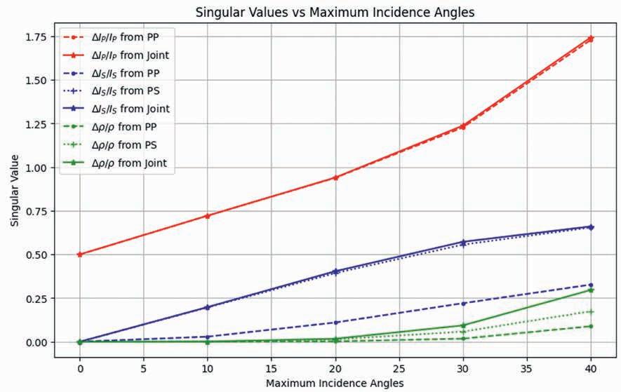We further clarify this by conducting a singular value decomposition of the AVO equations. The results are for Ip, Is and density from PP data, PS data and joint inversion of PP and PS data as shown in Figure 8. Here we see that Is is significantly improved with joint inversion or just PS inversion. Further, density inversion can be much more accurate with joint inversion.