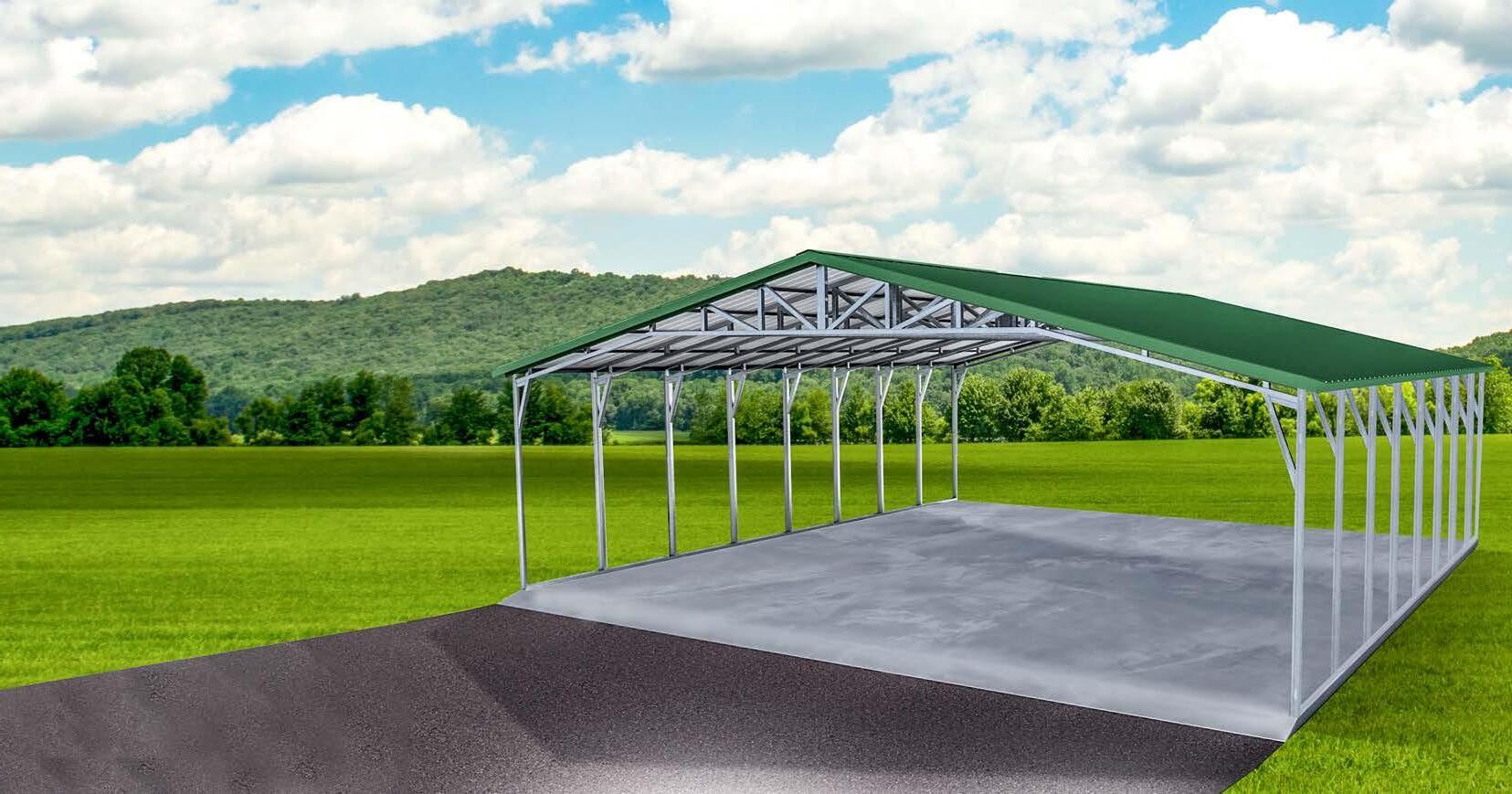 Commercial grade features include 14 gauge galvanized steel truss system with industry leading tubular knee bracing, 29 gauge metal roofing with 20 year Beckers paint system, framing spaced 5’ on center, concrete anchors or earth auger anchors are included in base price. Eagle Carports, Inc. is not responsible for stopping, or repairing leaks under base rails. Base leg height is 8’ tall. Please note: Eagle Carports, Inc. does not provide any site work. Truss design may vary slightly (from picture above).