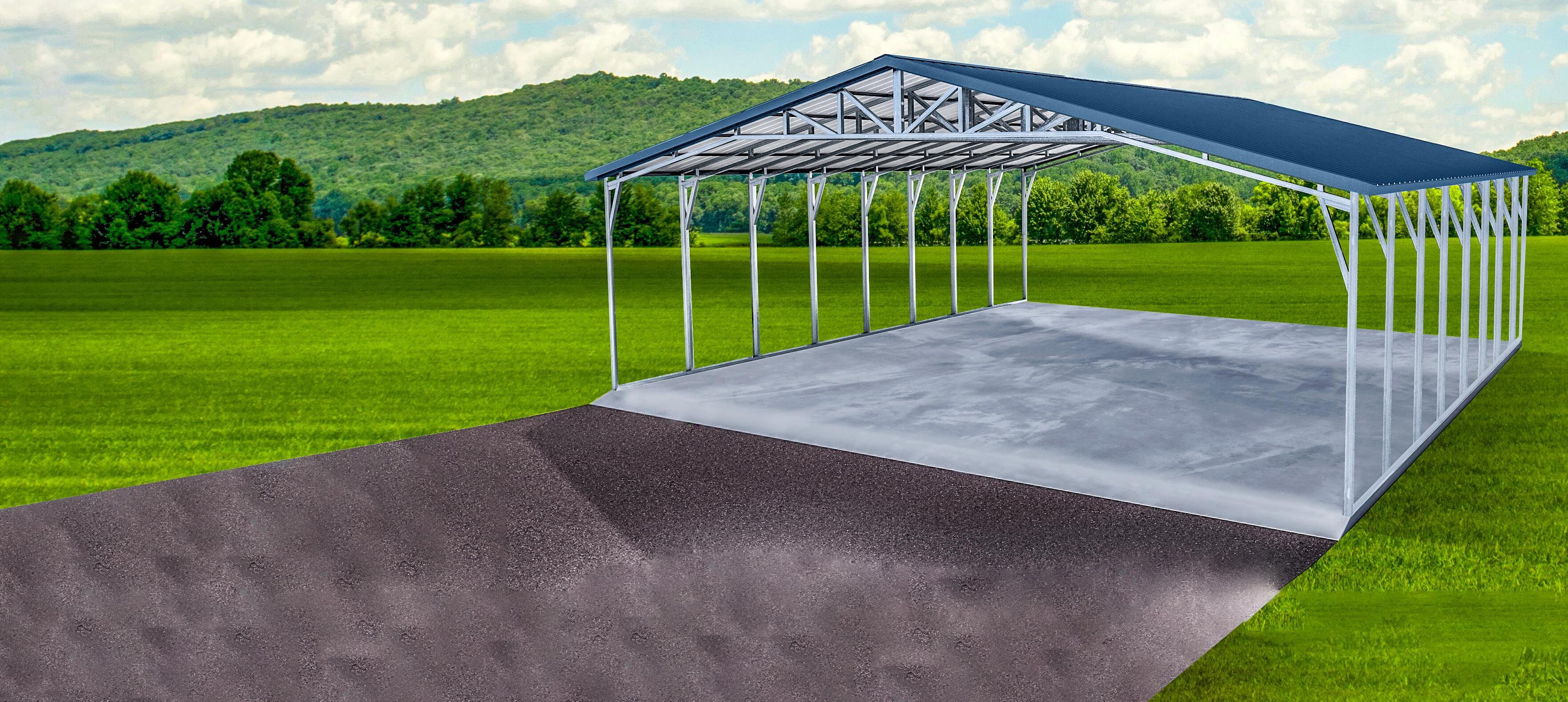 Commercial grade features include 14 gauge galvanized steel truss system with industry leading tubular knee bracing, 29 gauge metal roofing with 20 year Beckers paint system, framing spaced 5’ on center or less, concrete anchors or earth auger anchors are included in base price. Eagle Carports, Inc. is not responsible for stopping, or repairing leaks under base rails. Base leg height is 8’ tall. Please note: Eagle Carports, Inc. does not provide any site work. Truss design may vary slightly (from picture above).