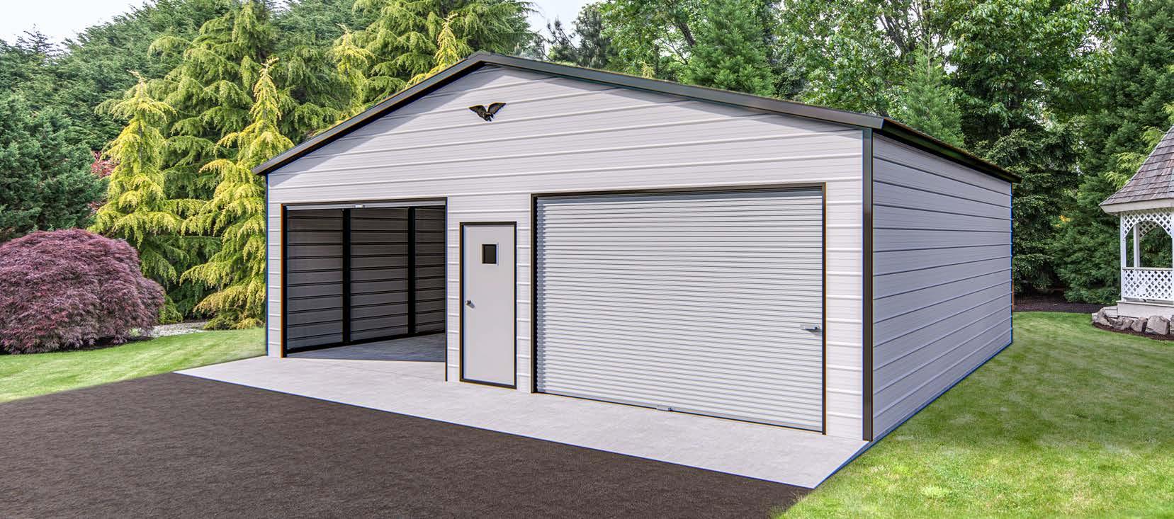 Pricing shown is for Risk Category I/Wind Exposure B. Please call for Risk Category II/Wind Exposure C options. Garage package features include the following: one 36”x80” walk-in door, two 24”x36” windows, listed garage doors, 14 gauge galvanized steel framing, 29 gauge metal roofing with 20 year Beckers paint system, framing spaced 5’ on center. Garage packages include both peak and leg bracing for additional strength and stability. Concrete Anchors or Rebar Anchors, and Earth Auger Anchors are included in base price. Eagle Carports, Inc. is not responsible for stopping, or repairing leaks under base rails. Base package height is 9’ tall. Please note: Eagle Carports, Inc. does not provide site work.