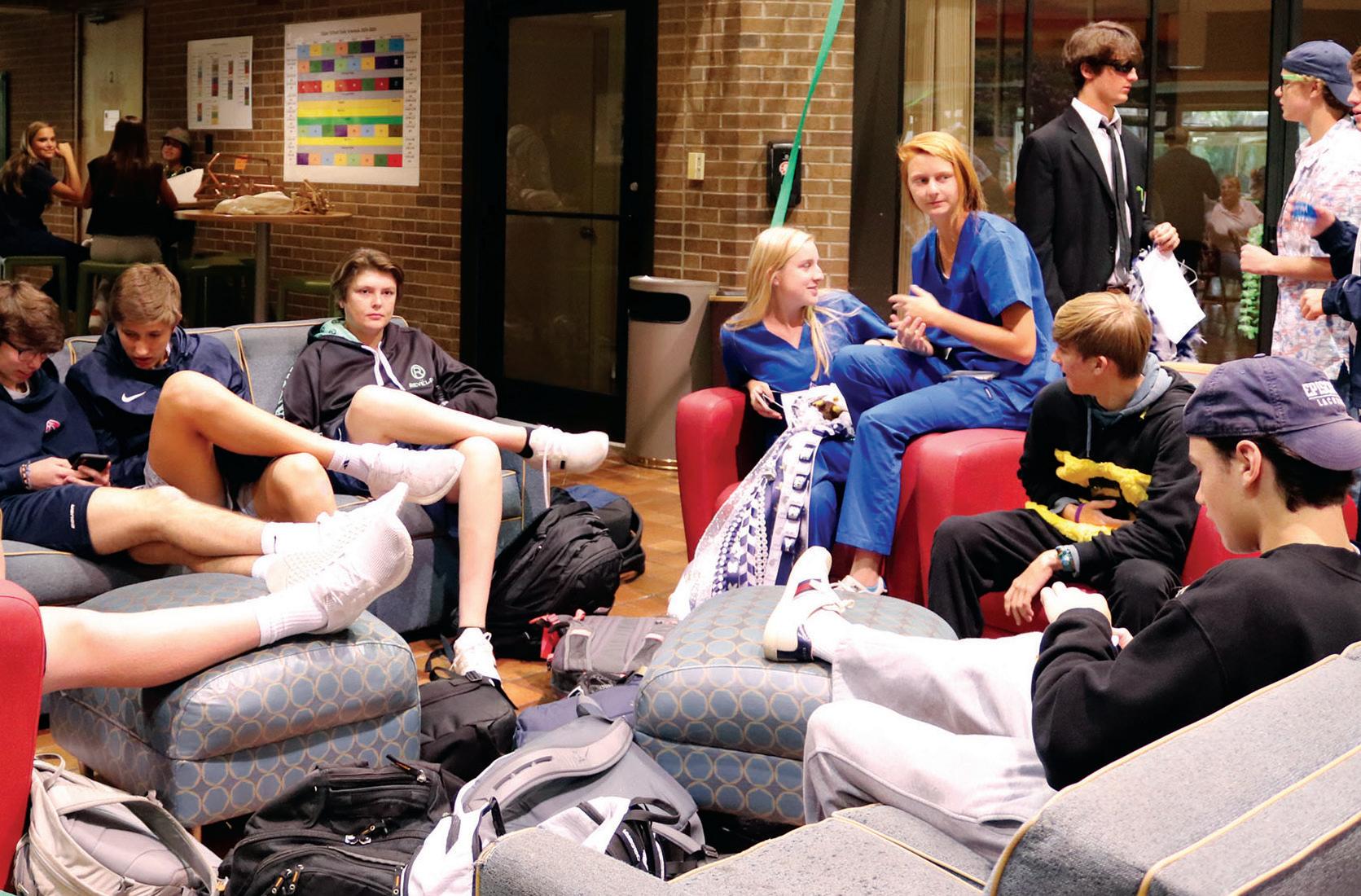 COMMONS COMMOTION In the commons, sophomores Chase Arnott, Austin Page and Kate Elliston gather on the couches during mini flex on Oct. 17. The sophomore grade received two warnings about taking over space from middle school students. “The commons is a great place to see friends after every class, discuss the