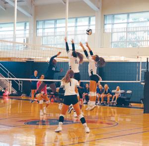 HITTING HOME Freshman Alexa Grabow jumps up to spike the ball in a game against the Red River School on Oct. 8. The team won the game 3-0. "Joining the team as a freshman, I was pretty intimidated by everyone," Grabow said. "That soon changed when the other girls welcomed me with open arms. I feel like I have been a part of the team forever." photo by