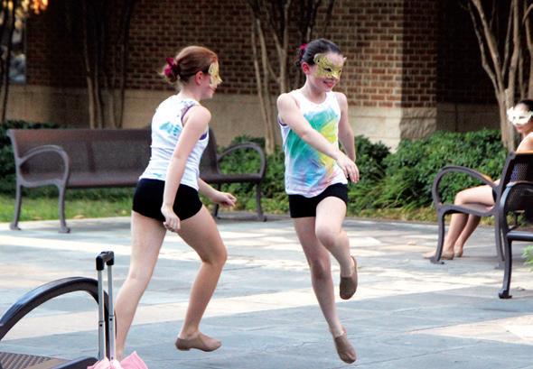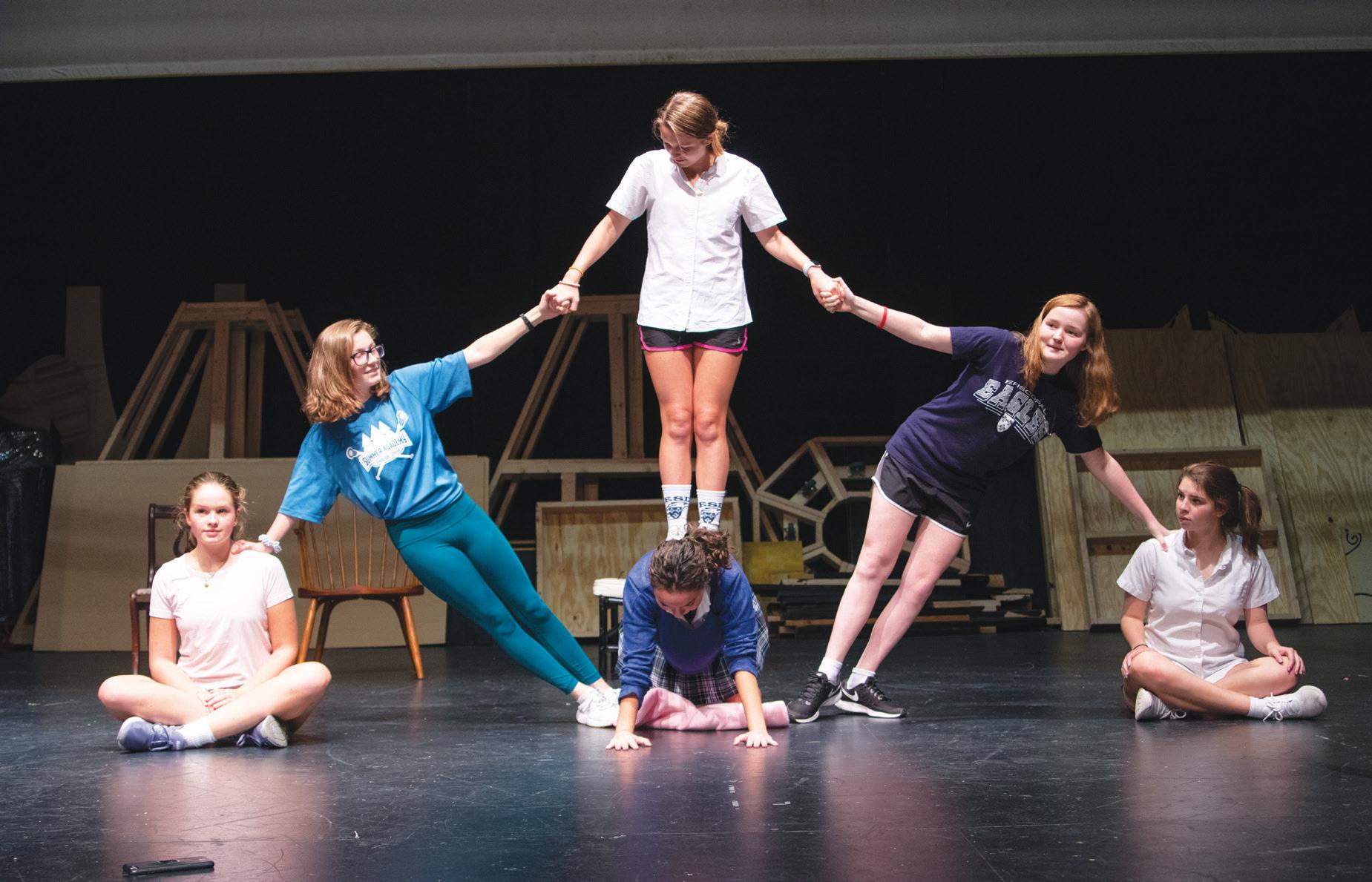CART WHEELIN’ Sophomores Sofia Sabella and Virginia Nussbaumer (left) work with technical director and technical theater instructor Lauren Redmond to perfect their stunt for “A Midsummer Night’s Dream.” Cast members have attended four rehearsals a week to prepare. “We have to learn some things I never thought I would ever do, but I feel really lucky to be able to be a part of this,” Sabella said. “It is so much fun, and all the girls I’m doing this with are amazing.” photo by Riley Breaux