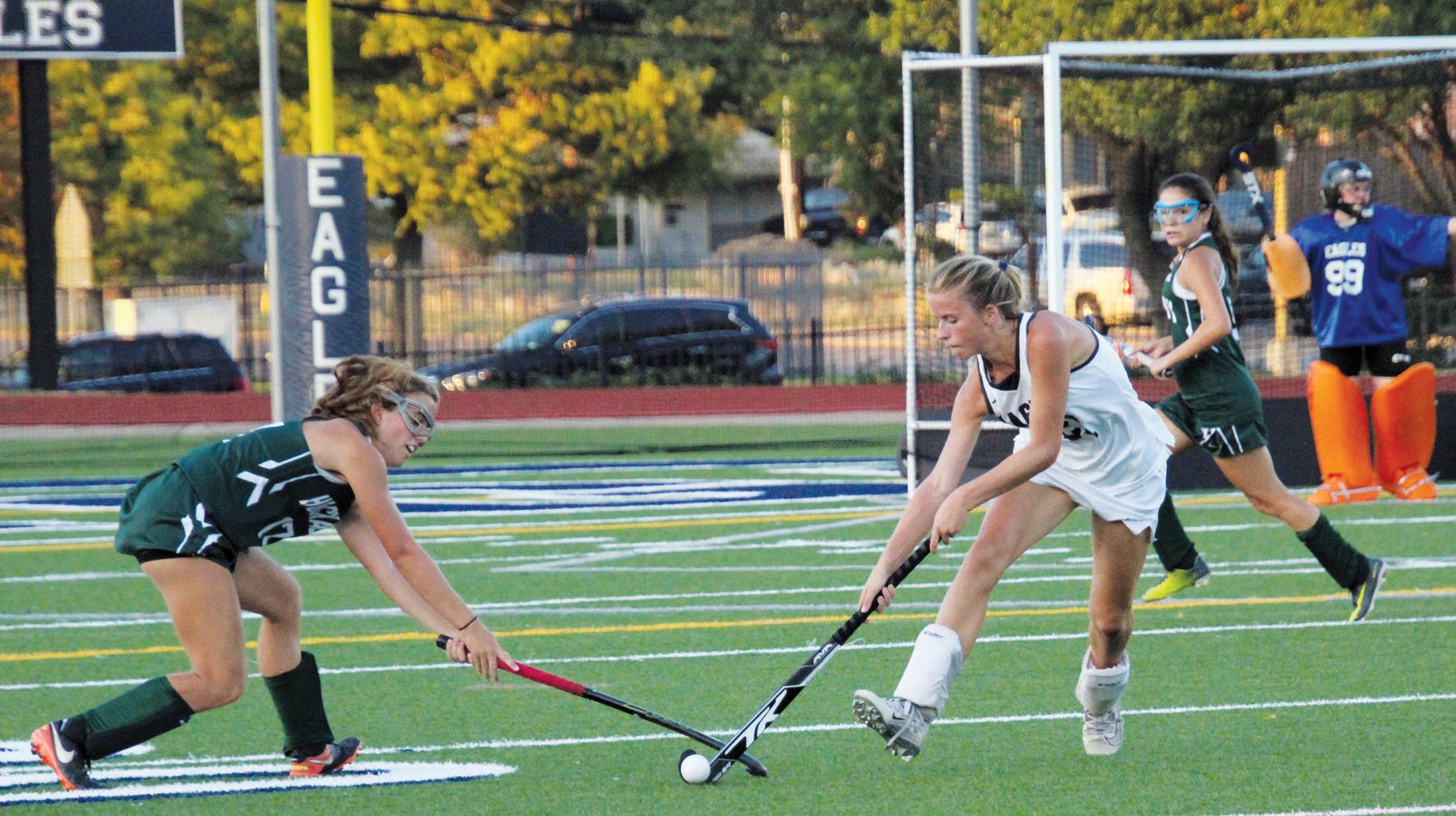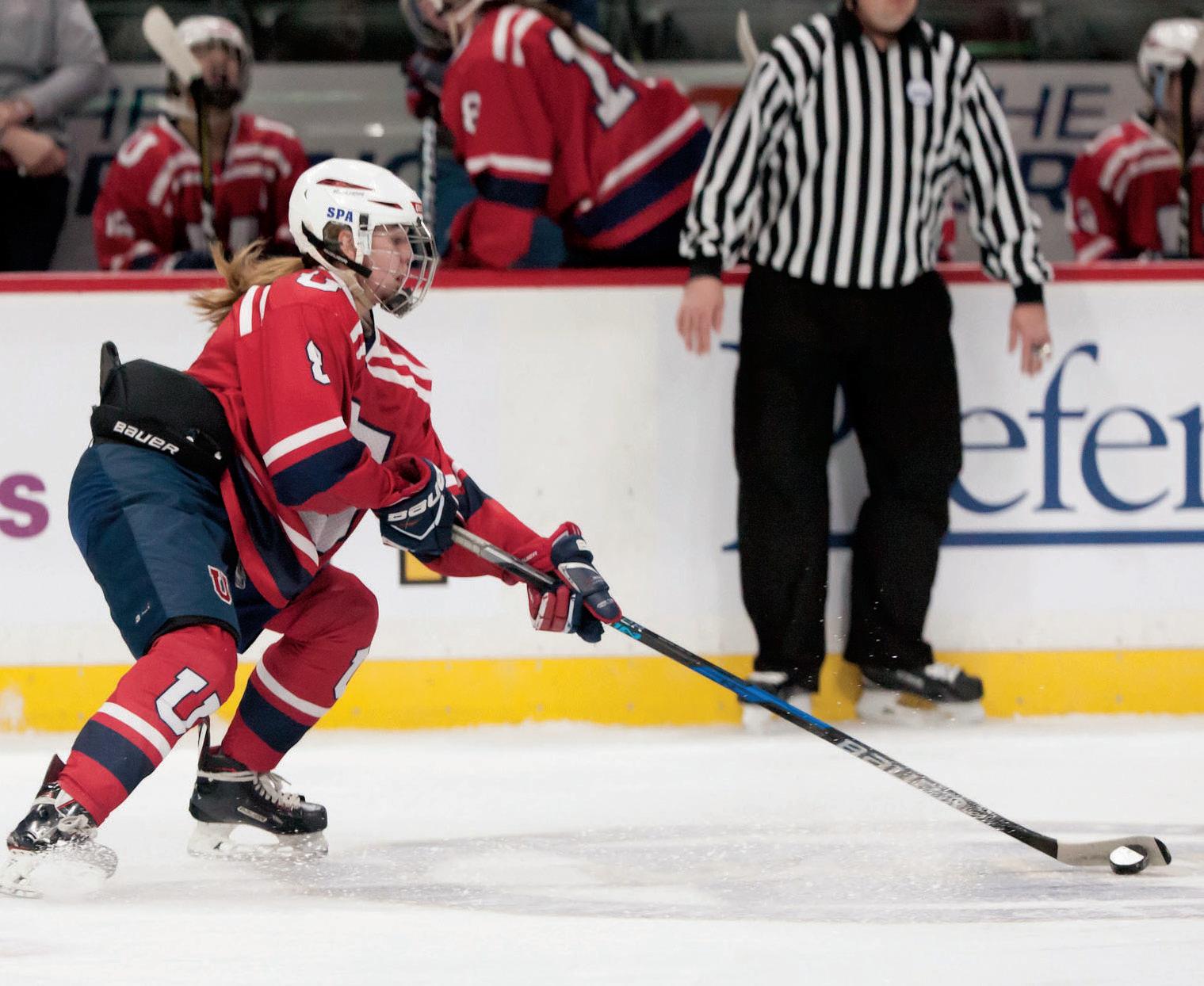 BREAKING THE ICE Junior Eleanor Winges swings at the puck during an ice hockey game. Winges began playing hockey when she was seven and now plays weekly. “The toughest part of the game, but also the most exciting, is during the third period when you are tired and have to be able to mentally stay in the game and fight in order to win,” Winges said. photo courtesy of Eleanor Winges