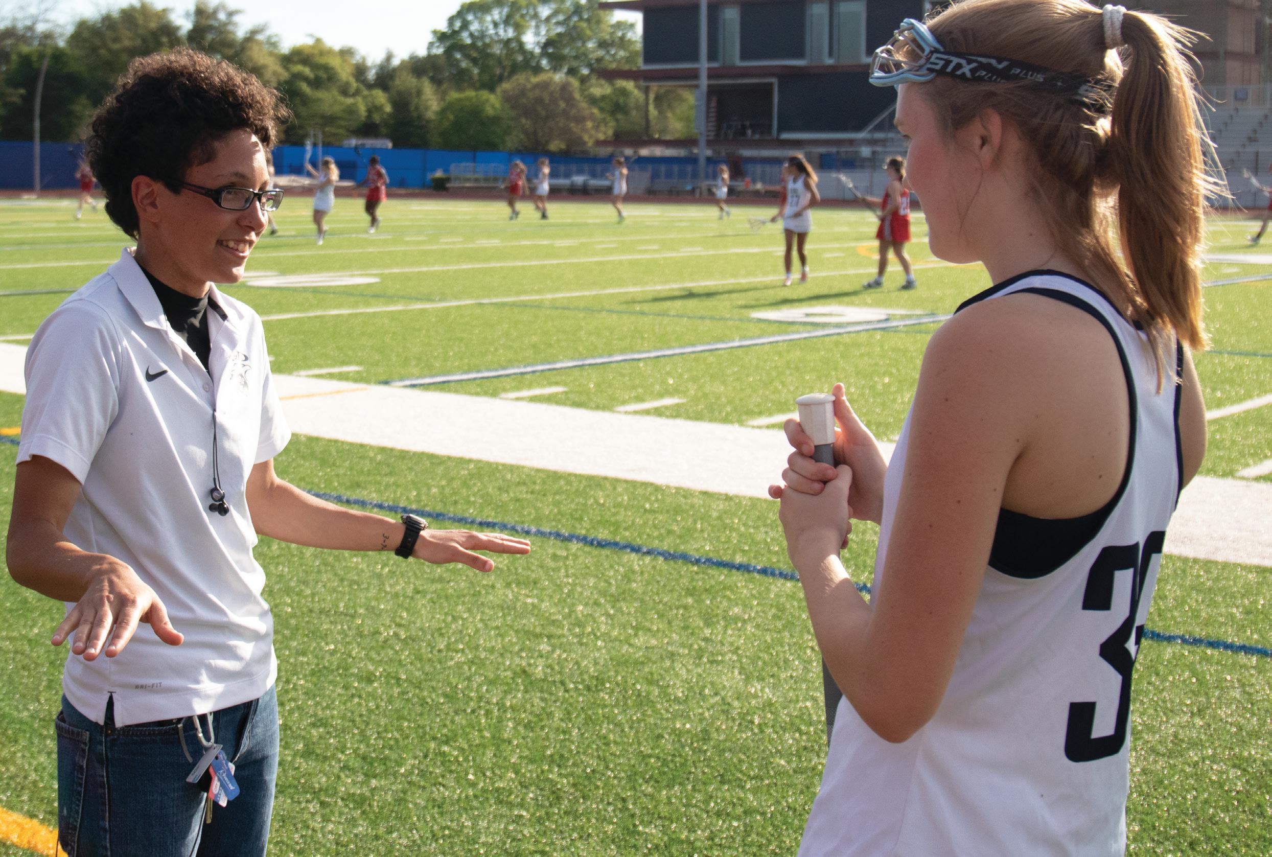 LAX ON, LAX OFF Junior varsity womens lacrosse coach Crystal Wiley gives feedback to sophomore Charlotte Esping during a game on April 9. The Eagles beat Ursuline Academy 10-3. “This was one of our strongest games,” Esping said. “Our offense did really well, and we were able to score several goals as a team.”