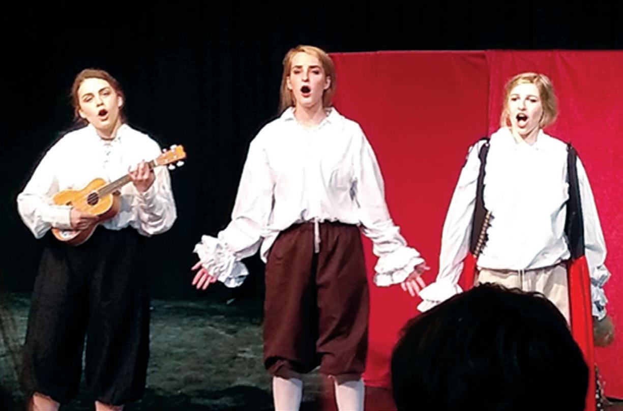 CURTAIN CALL In a performance of “The Complete Works of William Shakespeare (Abridged)” on April 12, senior Alexandra Everbach, sophomore Madison McCoy and junior Gracey Thomas run lines at ISAS. The play was a comedic take on the works of the famous author. “It was my first time in my high school theatre career that we had done a one-act at ISAS,” Everbach said.