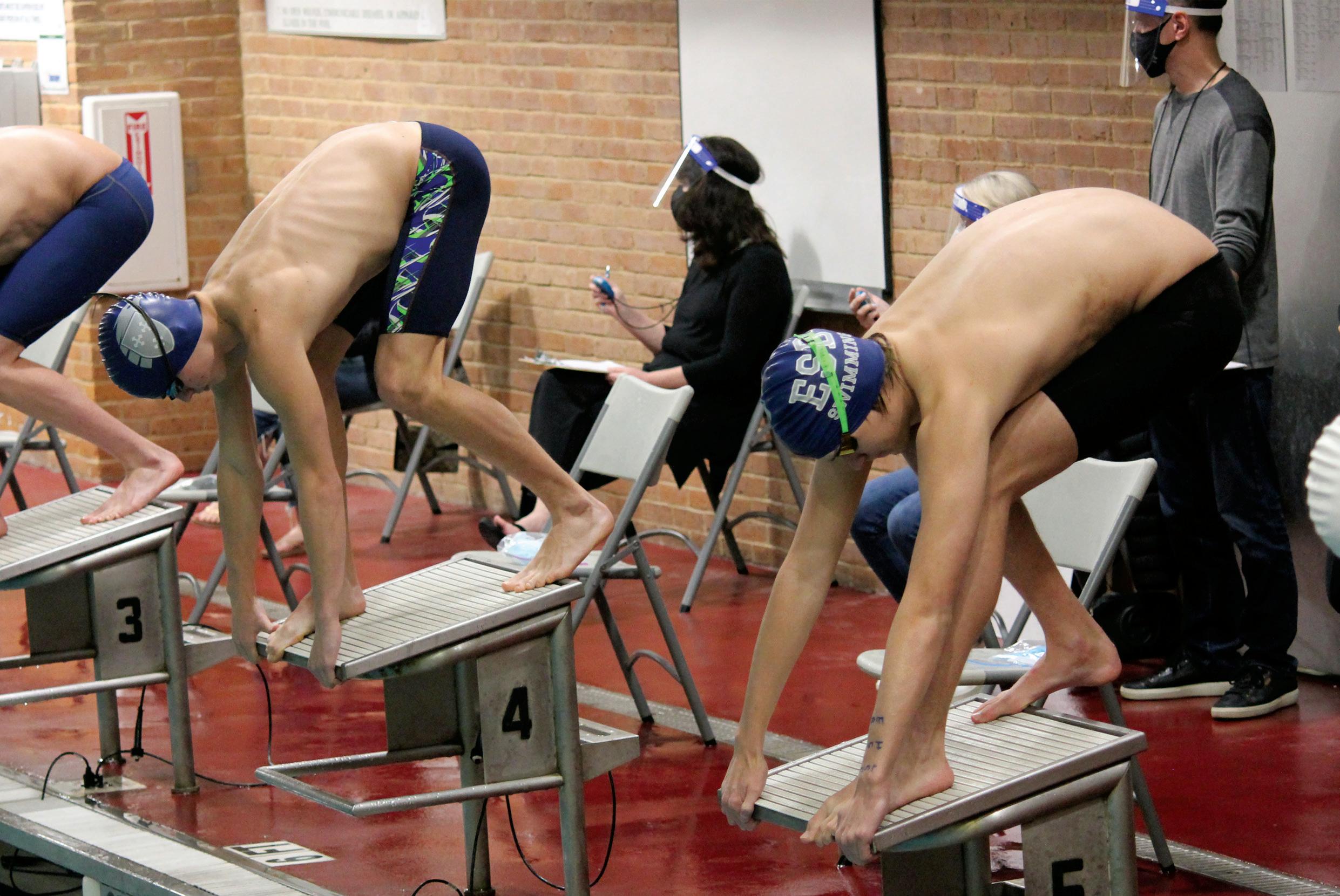 Awave of chlorine fills their noses as they walk into the natatorium swim deck; the three sophomore athletes are suited and ready to dive in their lane just in time for their designated warm-up. Despite a coach, the pack is prepared to compete against the rest of the North Zone SPC athletes to win their heat—consisting of a group of eight swimmers that swim at the same time in different lanes—and place high in their events.