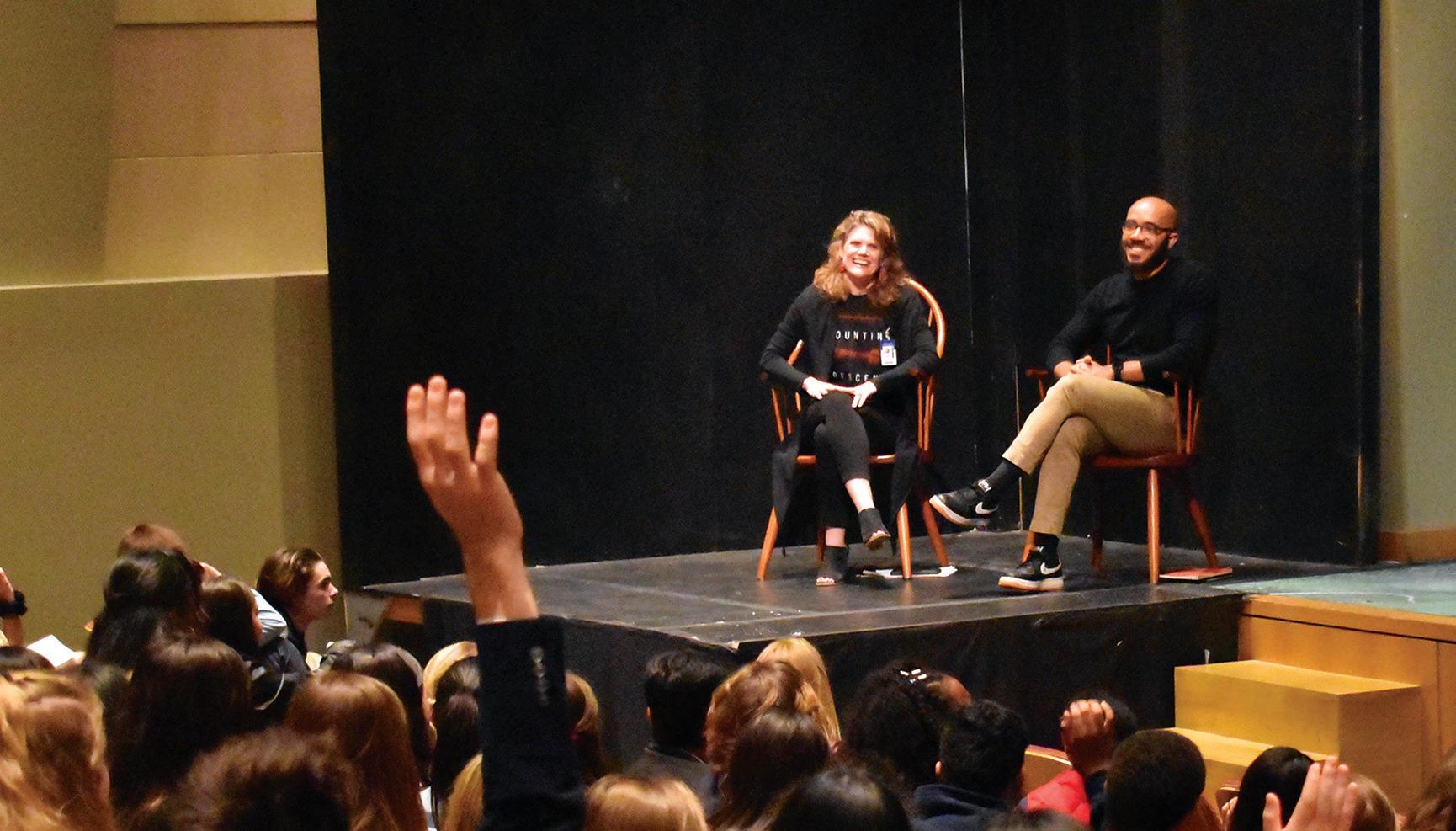 Department Chair Tolly Salz and poet Clint Smith answer questions about Smith’s works. Smith visited the school on Feb. 3 to encourage students to start difficult conversations and share their work with others. “We like to think about how our students connect and learn how to have intellectual conversations with people you haven’t gone to school with,” Salz said.