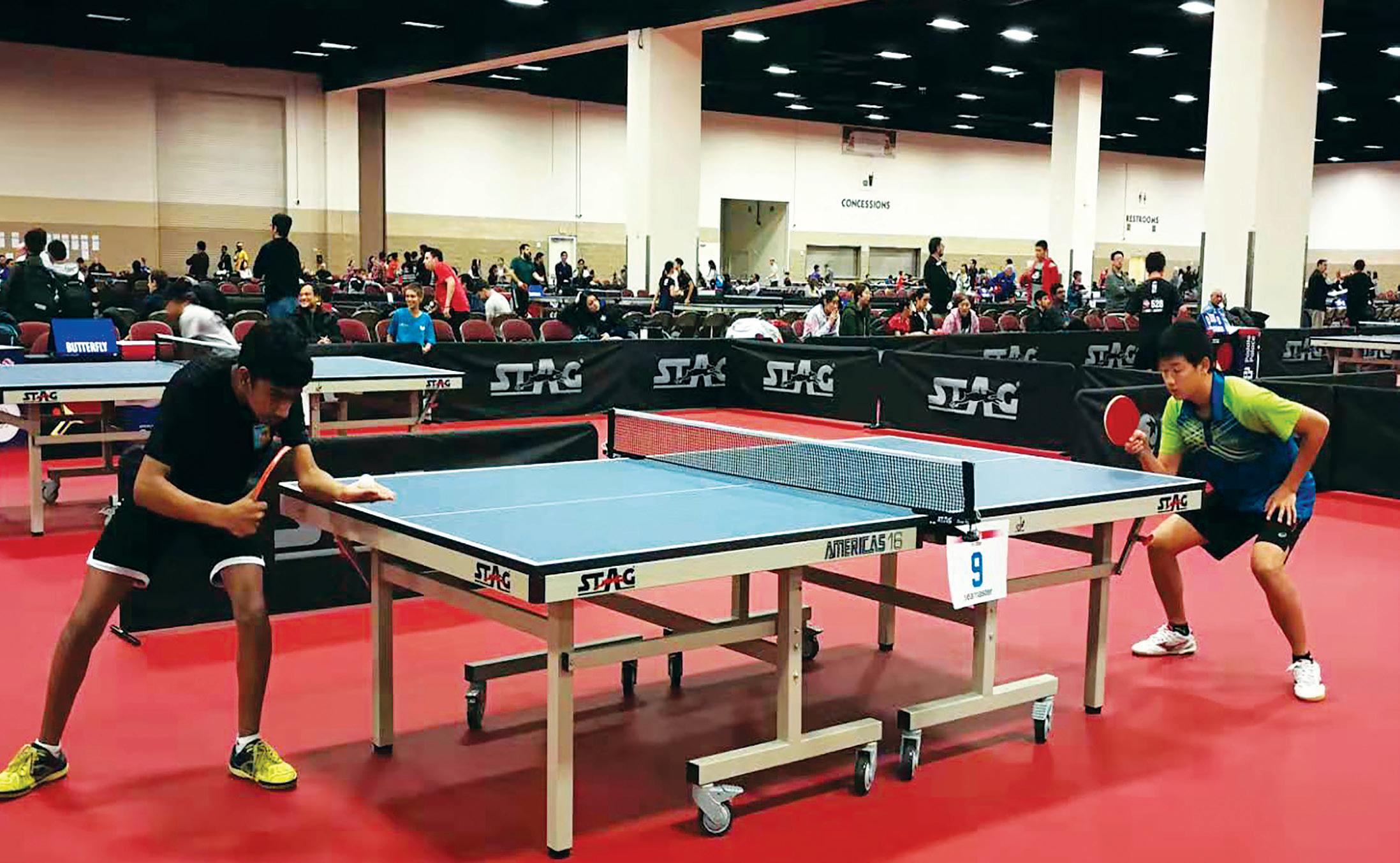 Tom Qiu serves the ball with all of his might across the table to his opponent. The ball swiftly falls off the other end, and he scores one point. His opponent, caught off guard and frustrated, now plays under pressure.