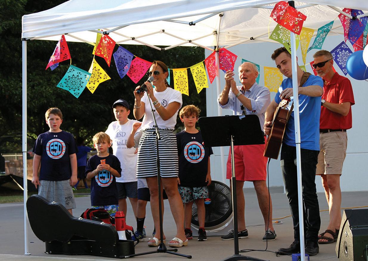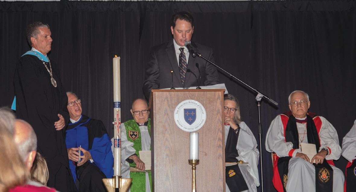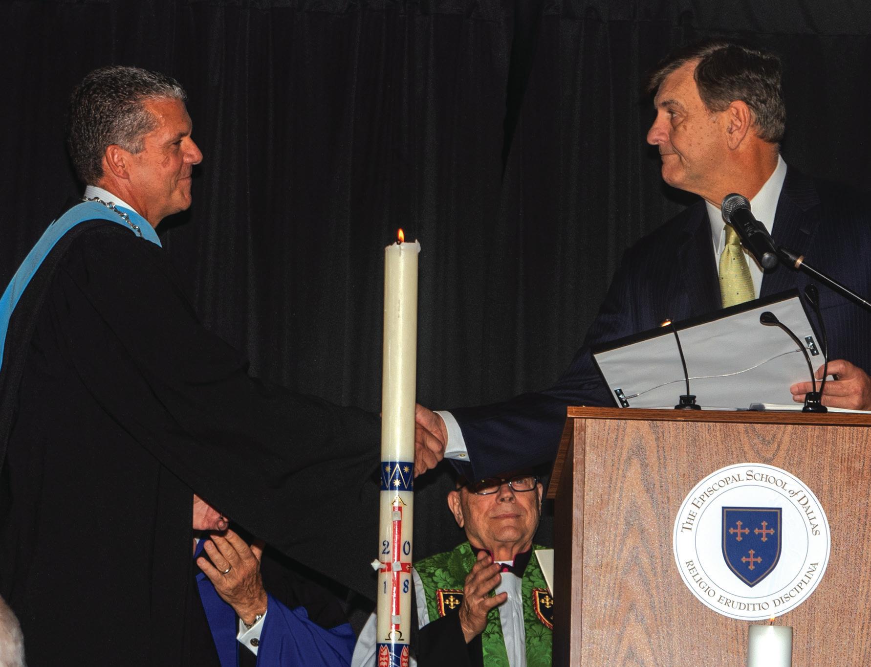 A WARM WELCOME Head of School David Baad and Dallas Mayor Mike Rawlings shake hands after Rawlings’ proclamation, welcoming Baad to the city during the installation service on Sept. 20. “On that day, I [felt] an enormous sense of gratitude,” Baad said. “The thing I [was] most excited for [was] the keynote speaker, Vance Wilson.”