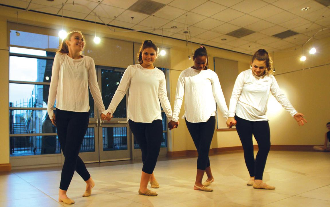 4 DANCING QUEENS: Juniors Maggie Lipscomb, Mackenzie Parish, Alexandra Everbach and freshman Claire Everbach perform in the “Arts in Motion” dance show. Middle and Upper school students choreographed their own routines. “It’s one of my favorite shows that we do because it is the first impression people have of the dance program, and it’s really exciting to hear that our audience enjoyed the performance,” Lipscomb said. Photo by Julia Beckel