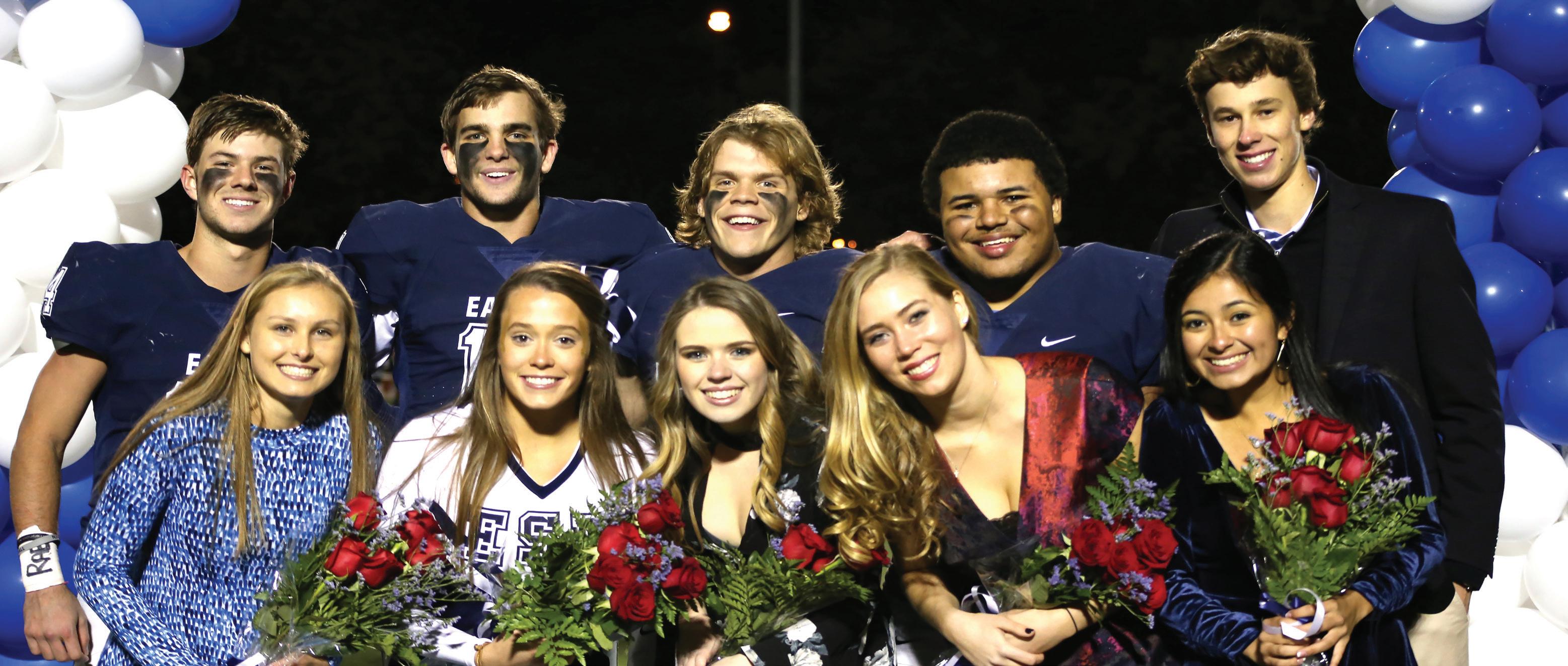 1. GAME OF THRONES: The homecoming court poses for a photo at halftime. The nominees were seniors Braden Rhone, Patrick Skalniak, Patrick Duffner, Wesley Banks, Hudson Woods, Sophia Stener, Cierra Gordon, Ellery Marshall, Alexa Lutz and Emma Cabrales. “It was really nice to be nominated by the student body and fun to look up into the student section dressed in costumes,” Stener said. Photo by Ellery Spencer