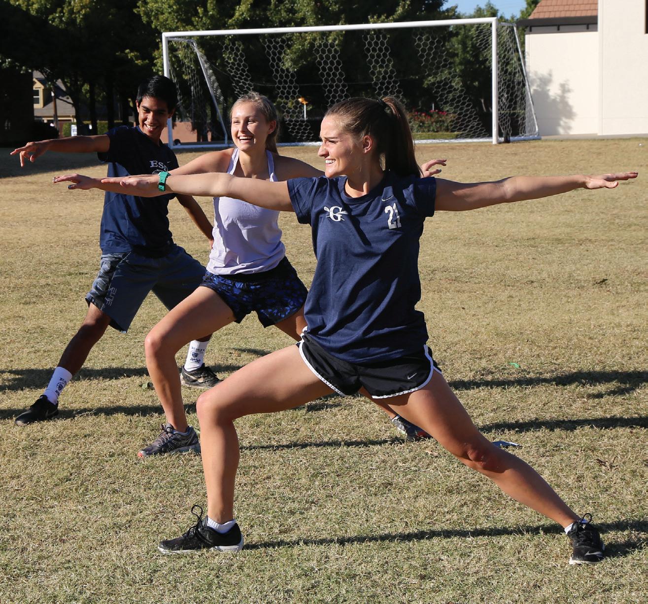 STRIKE A POSE: On Oct. 30, sophomore Alan Benitez and senior Sophia Stener stretch out into a “warrior II” yoga pose alongside coach Kendall Berents. “I like doing yoga with coach [Berents] because she’s very professional about it and tries to challenge us and force us to do the right poses and positions,” Benitez said.