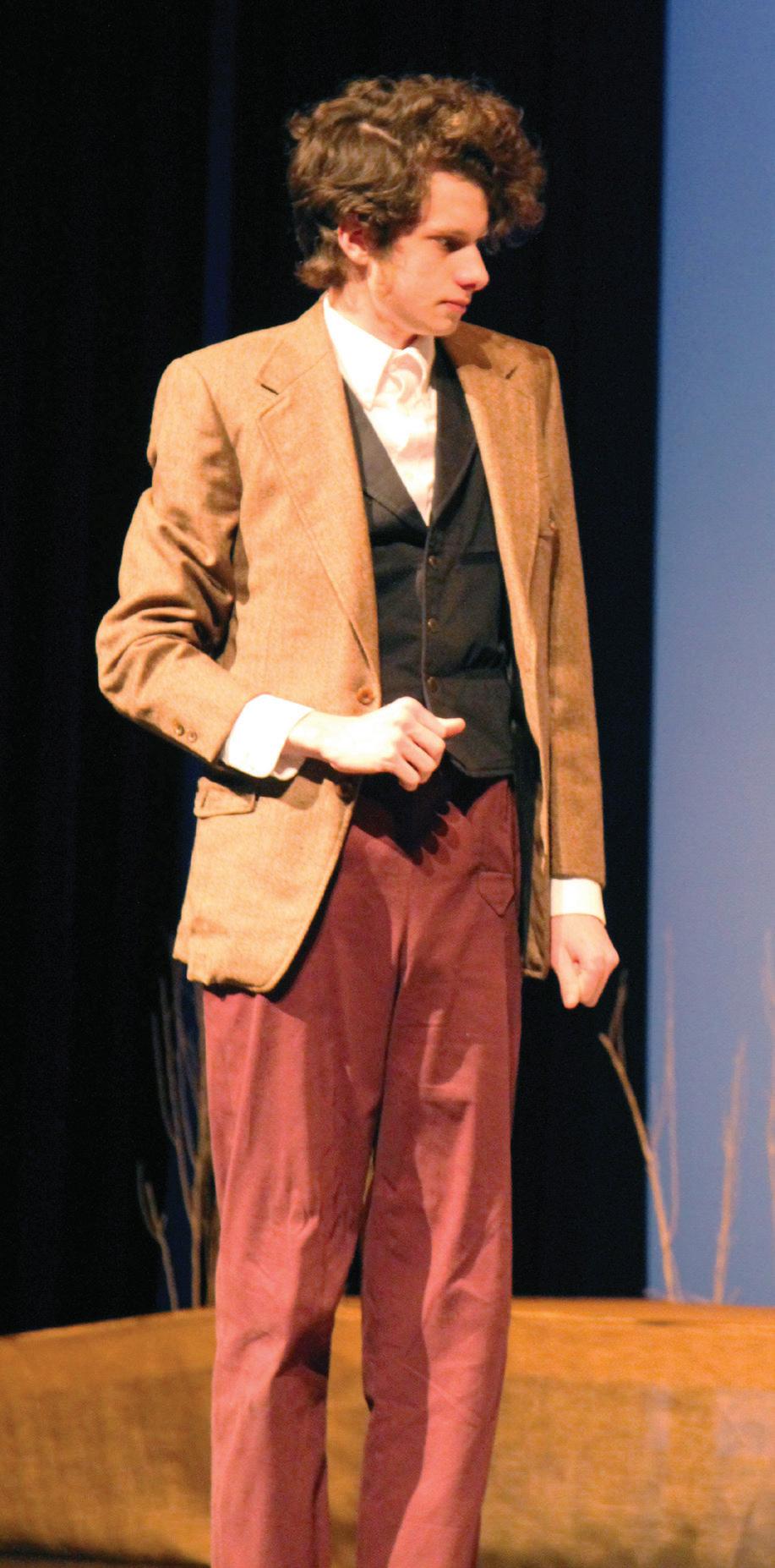 CENTER STAGE: Junior William Hargrave practices his lines for the first time in costume on Oct. 30. He plays Dr. Galen P. Gray, a quirky doctor with an aversion to blood. A love triangle develops between the doctor and the two Muldoon women. "As June attempts to initiate a courtship with the doctor, he and Rebekah only become closer," Hargrave said. Photo by Lauren Egger