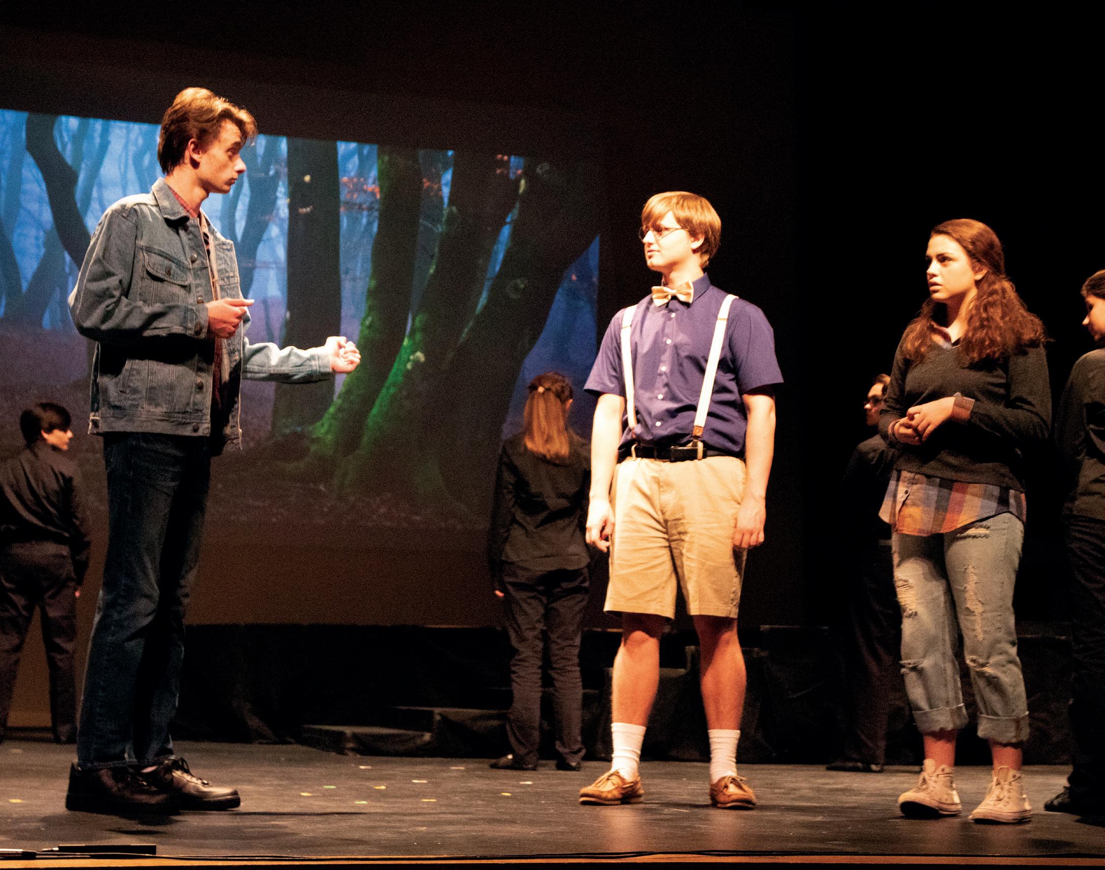 BREAK A LEG On Oct. 16, seniors Cole Nugent, Will Minnis and Alexandra Everbach rehearse a scene in which Charles and Meg meet Calvin in the woods. Performances were held on Oct. 18, 19 and 20. “A lot of people, including me, can relate to [Meg],” Everbach said. “She learns to accept herself, which is a great message.” photo by