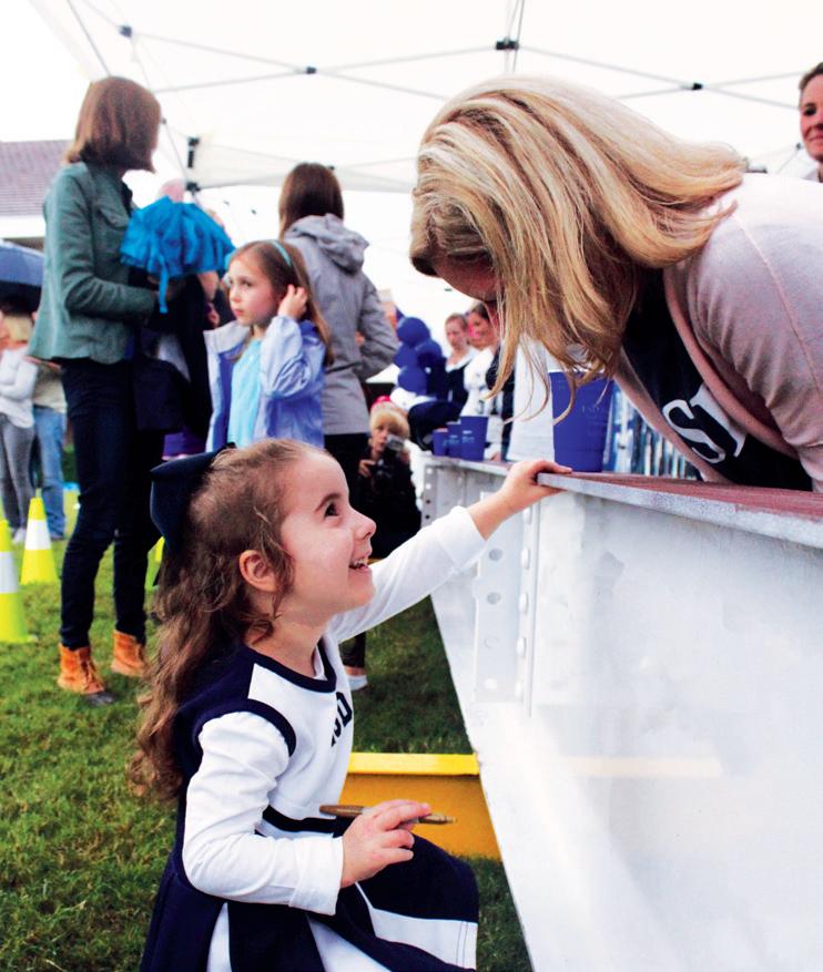 SAW THE SIGN A Lower School student autographs the construction beam on Oct. 12 before a varsity football game. Lower School students signed the beam to signify their place within the new building, which is expected to open next fall. “It was special to help the Lower Schoolers sign the beam,” junior varsity cheerleader Rachel Morrow said. “You could tell they are so excited to be coming to the new campus.” photo by Sarah Smith