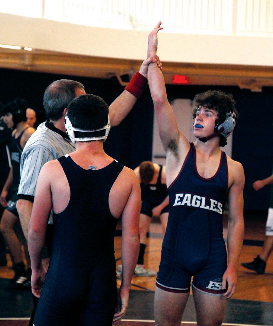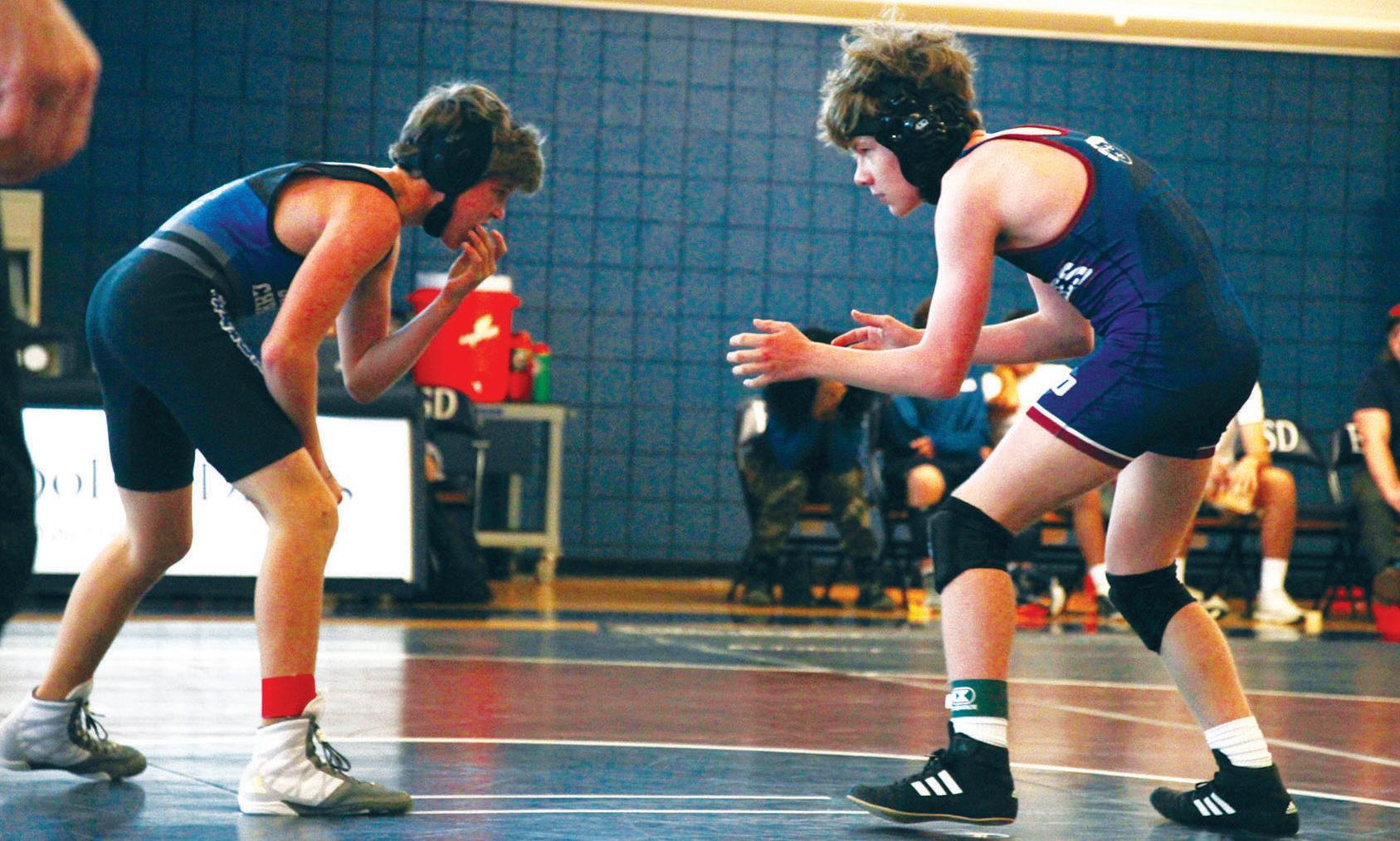 Freshman Judah Powell faces his opponent at the Eagle Duals on Dec. 2. He won one of the matches at the first home tournament. “In that moment, I felt locked in to what I was doing,” Powell said. “I wasn’t thinking about anything else besides what was happening at that current moment. I felt excited for the fact that this was my first match, and I enjoyed it.”