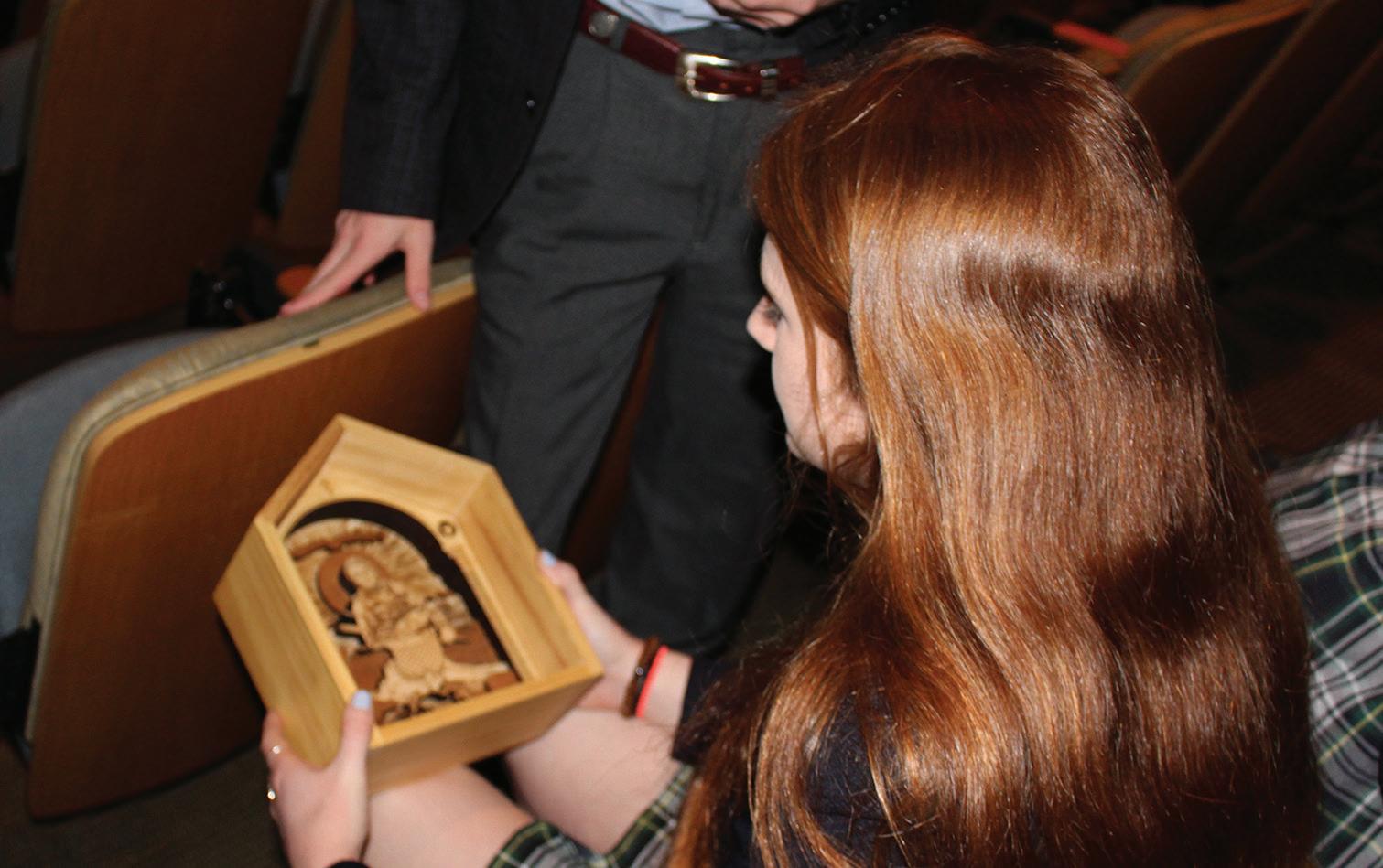 5. ART WITH PURPOSE: Story Langston examines the laser cut art inspired by Syrian refugees by Jave Yoshimoto, a professor at the University of Nebraska Omaha. “He showed me that you can make a change in other people’s lives with your creations,” Langston said. Photo by Gillian Campbell