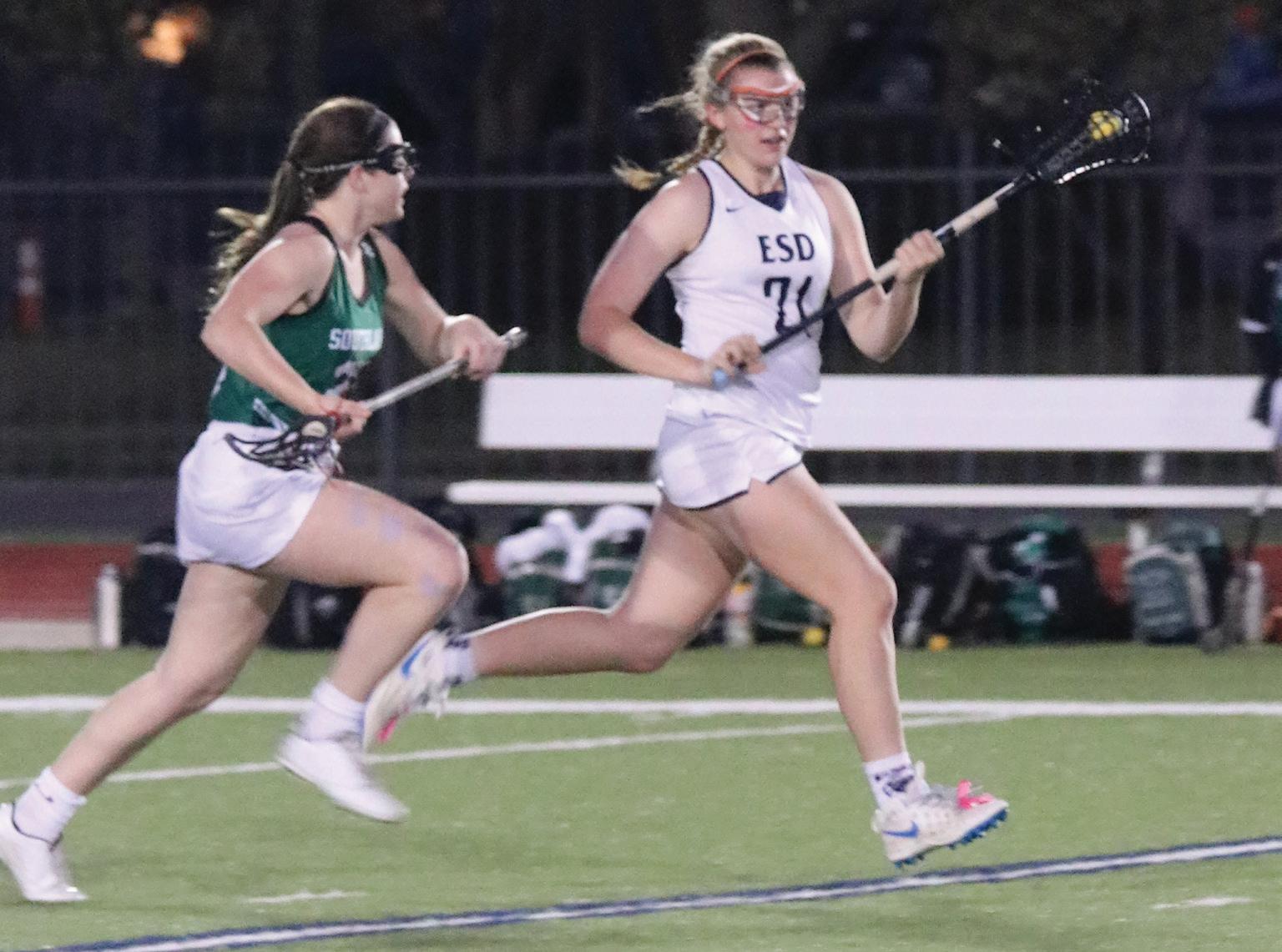 FLY EAGLES: Junior Anna Winkler sprints down the filed March 2. The Eagles dominated Southlake, beating them 19-1. “As the season continues, it will be exciting to see how the team grows,” she said. “I’m looking forward to the rest of our season.”
