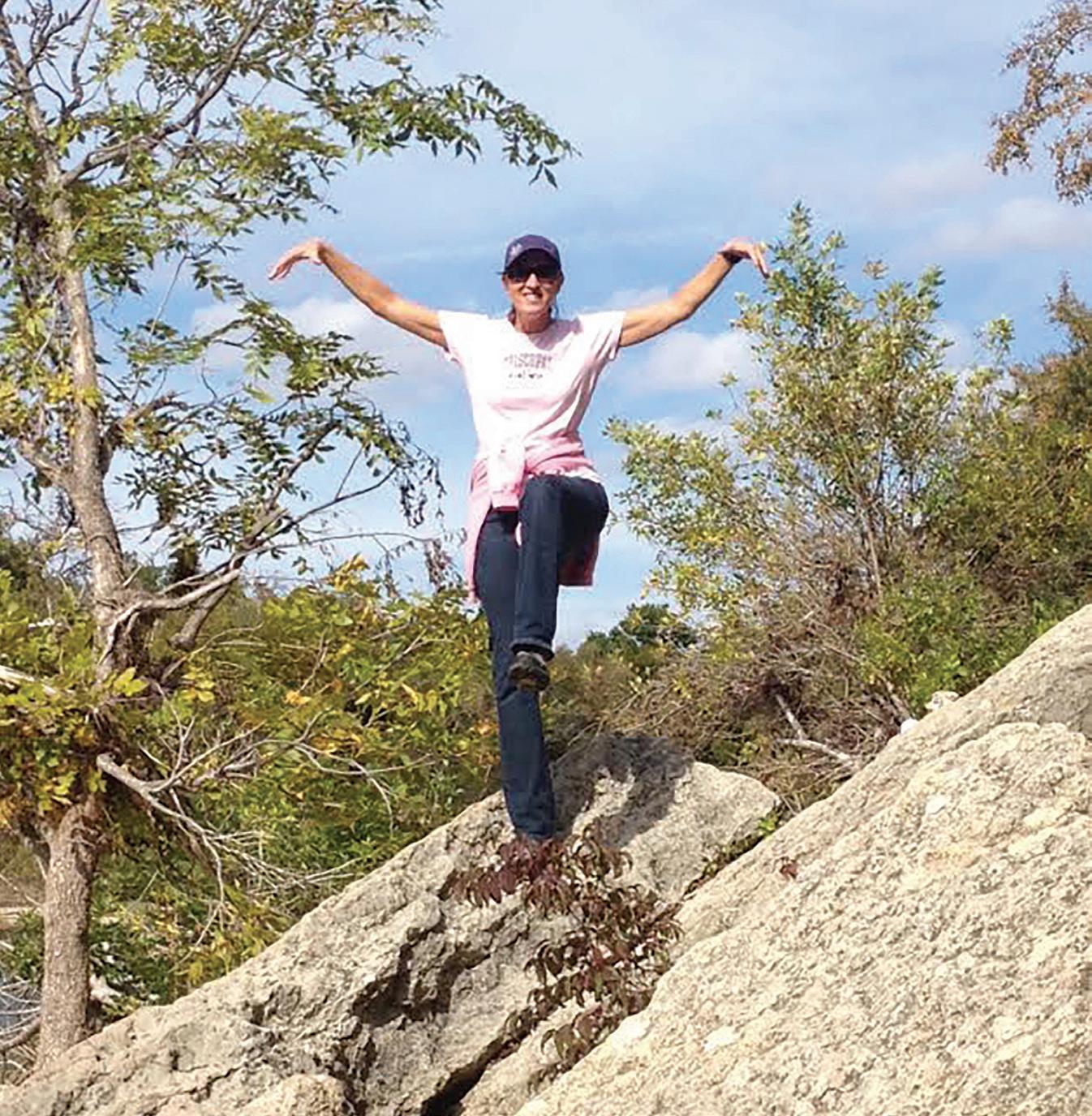 IN HER ELEMENT: Dawn Eatherly strikes a praying mantis yoga pose while hiking Pike’s Peak on the annual Enchanted Rock outdoor education trip. “It was fun getting to know Coach Eatherly and listen to her talk about all the nature around us,” junior McKinley Lawson said.