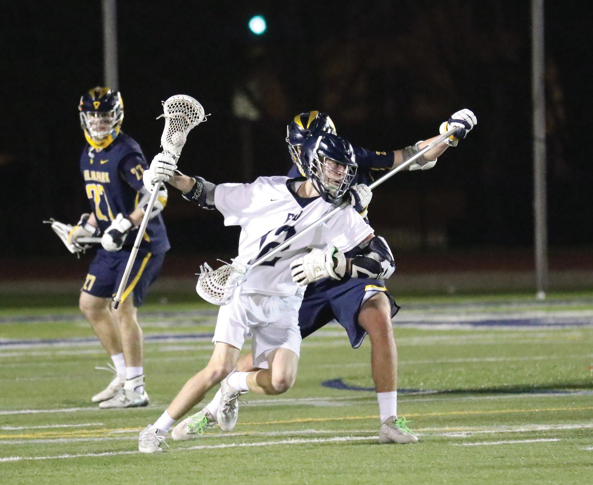 MEAUXTOWN: Senior Brandon Meaux, breaks away from Scott’s defenders March. 2. The Eagles won their first home game, 7-6. The Georgetown commit leads the team with 13 goals this season. ”Our strong defense and face-off play led to a big win over HP,” he said. “On offense, it was great to see a lot of young guys contribute.” Photo courtesy of Phresh Photos