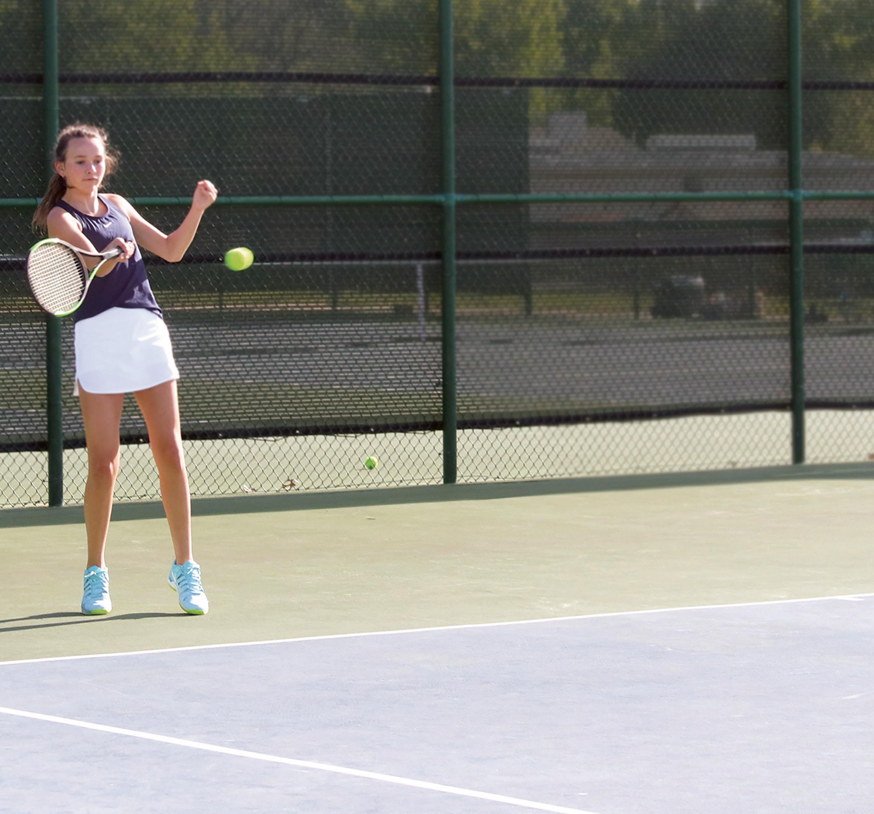 SERVE IT UP: Freshman Ally Jeter forehands the ball at her doubles match with freshman Neely Krispin against Hockaday on April 4. “Neely and I had a really good match, and we put in good effort,” Jeter said. “We’ve practiced a lot since that match and now we feel like we are capable of beating our rivals at SPC.”