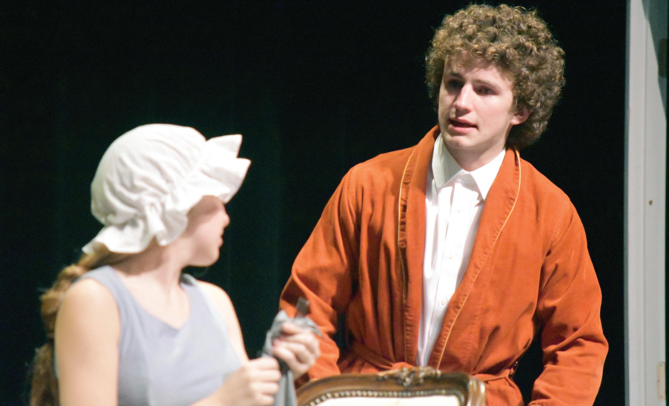 AROUND THE TABLE: Junior Christopher Talbot plays an eight year old boy, questioning why the maid, played by sophomore Gracey Thomas, is leaving the family to go get married. "I don't get a lot of chances to act so young, so it's pretty interesting to act as an eight year old and try to remember all those little mannerisms that you had when you were that age," Talbot said. Photo by Sohaib Raza
