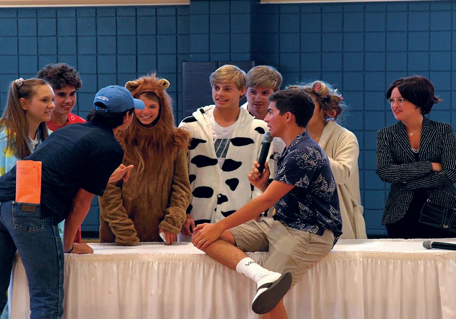 2. WE ARE FAMILY: Senior John Kuehne hosts Family Feud on March 22 for student body week. “It was something I had never done before but secretly wanted to do my whole life,” Kuehne said. “It was a lot of fun making fun of people’s answers, and I felt like I was in my element.” Photo by Katelin Gildersleeve
