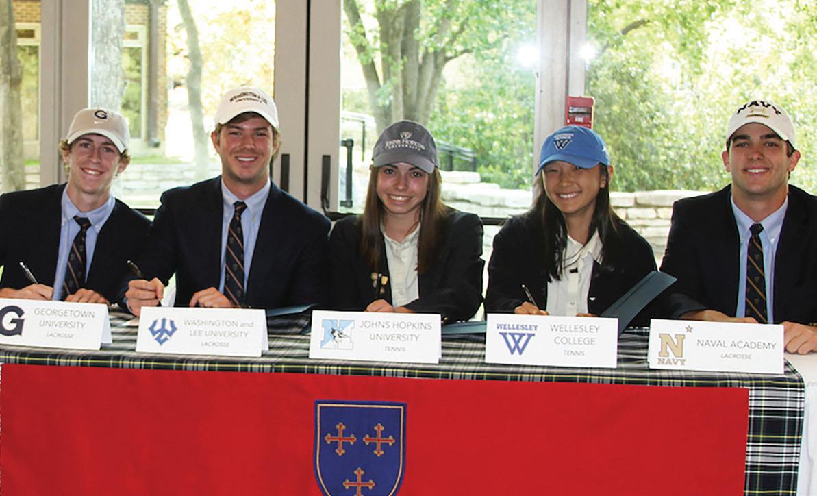 4. LEVEL UP: Seniors Brandon Meaux, Braden Rhone, Sophie Saland, Michelle Shen and Patrick Skalniak sign to play either lacrosse or tennis at the collegiate level on April 11. “I never thought I would get to this point,” Shen said. “I’ve never been more excited to play at the next level [at Wellesley College].” Photo courtesy of Emma England