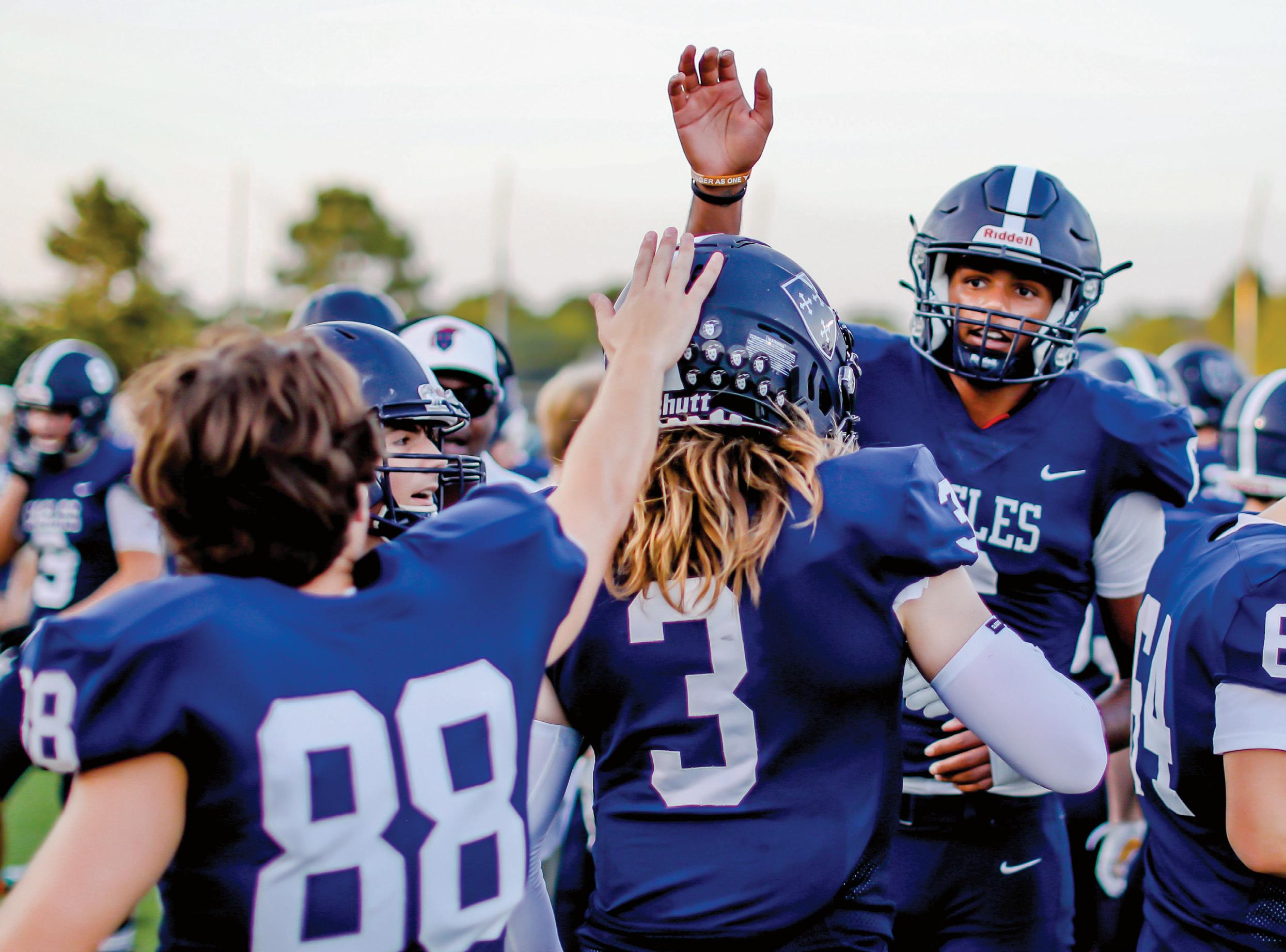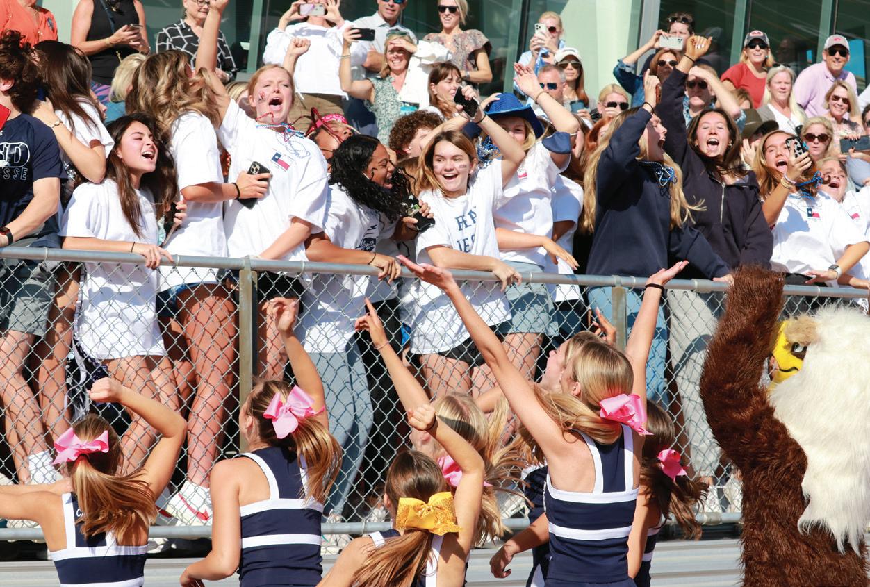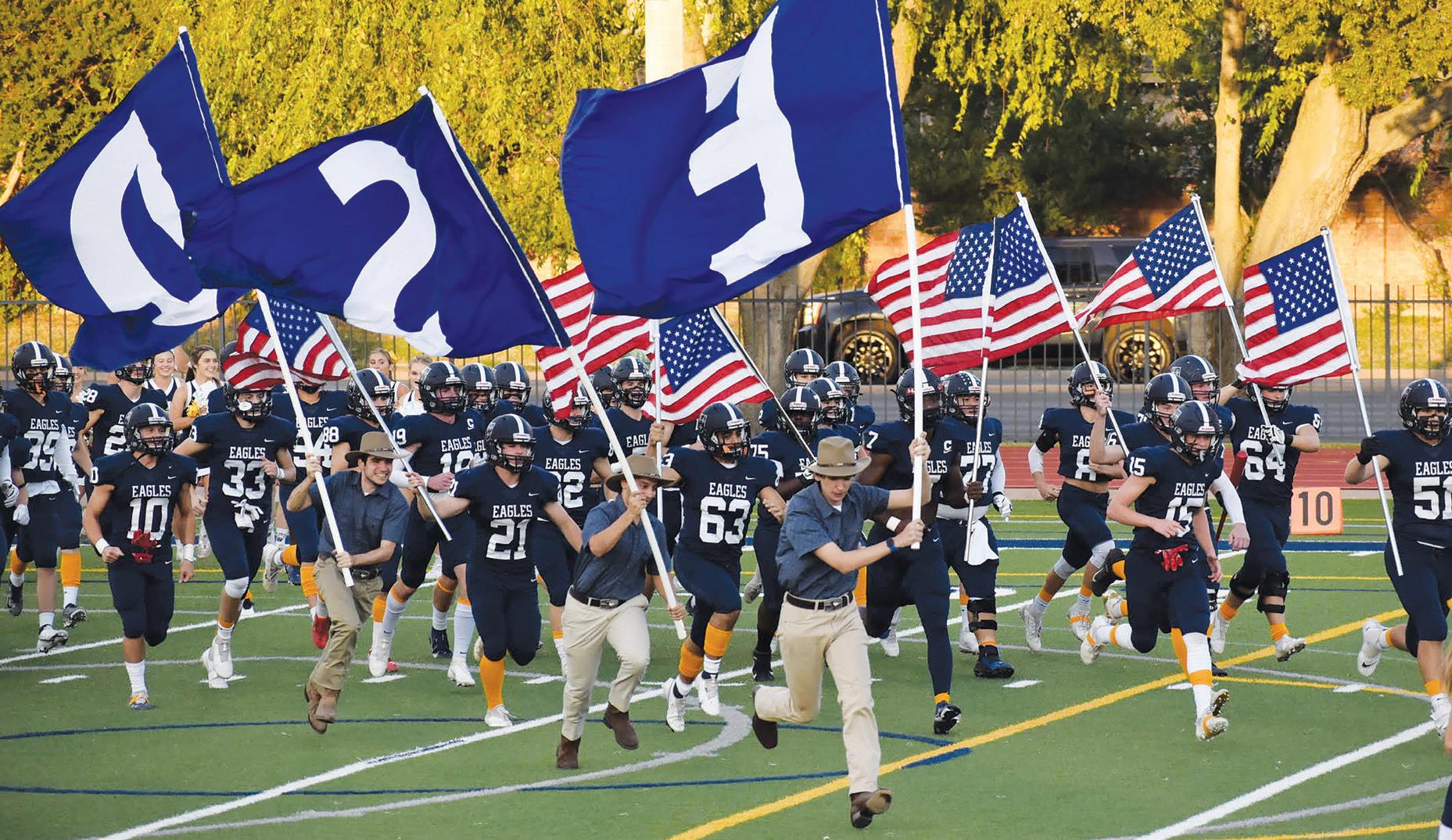 EAGLES YOU KNOW WHAT YOU GOT TO DO Wingmen lead varsity football players into victory at the homecoming game on Oct. 22. This victory against St John’s was a blowout with a final score of 46-18. The game was one of the many blowouts from the 2021 record-breaking season. Junior Blair Brennan felt the excitement in the middle of the heap. “It was great out there to see the whole school together,” Brennan said. “I really felt the energy out on the field.”