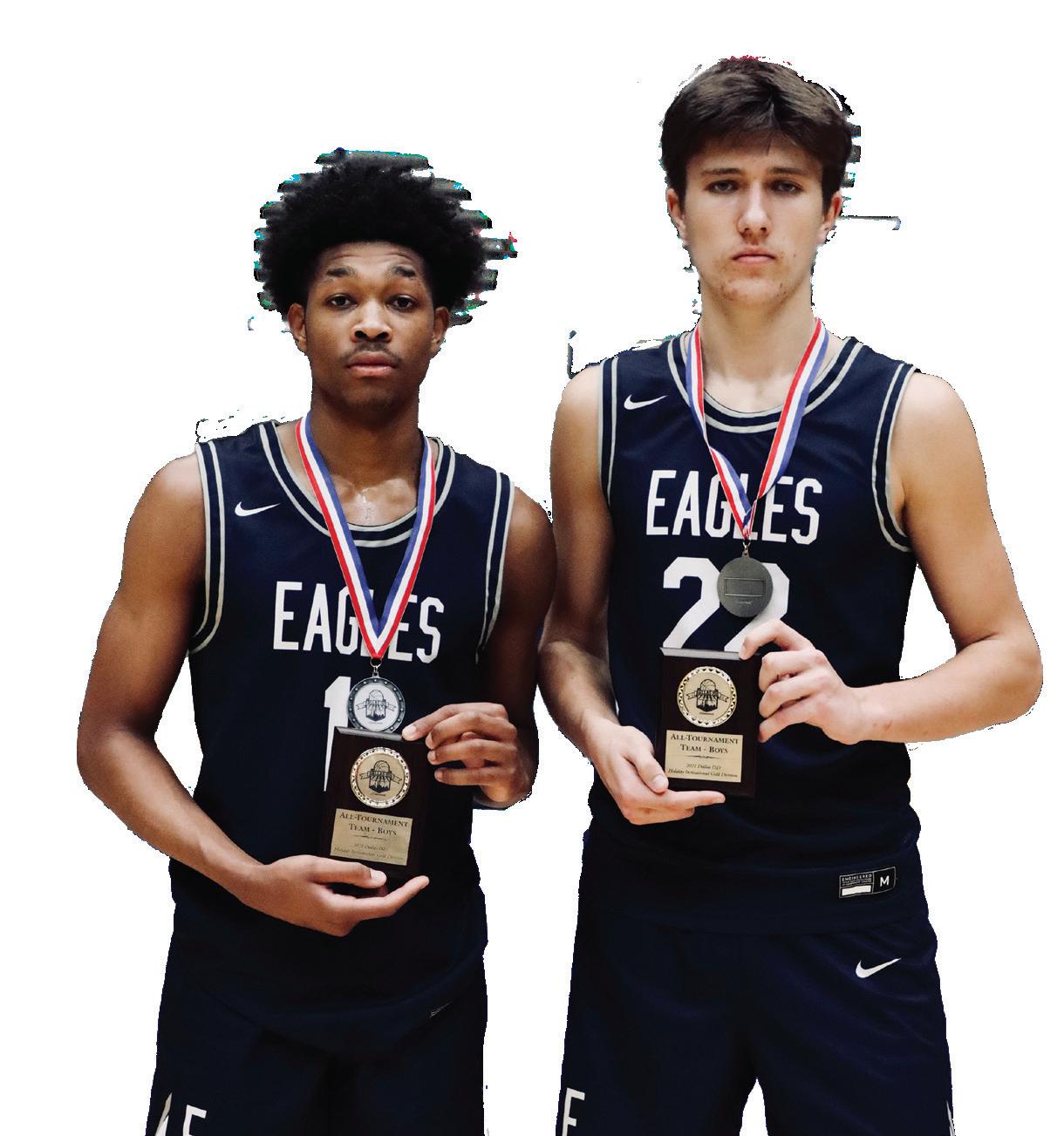 PLAYING WITH A PURPOSE Seniors Colby Henderson [left] and Austin Page [right] hold up their All-Tournament Team awards after three days full of playing. “It was a great journey through the tournament for the team.,” Page said. “Nobody thought we would make it as far as we did. It was very rewarding after all of our work and effort to prove the haters wrong.“