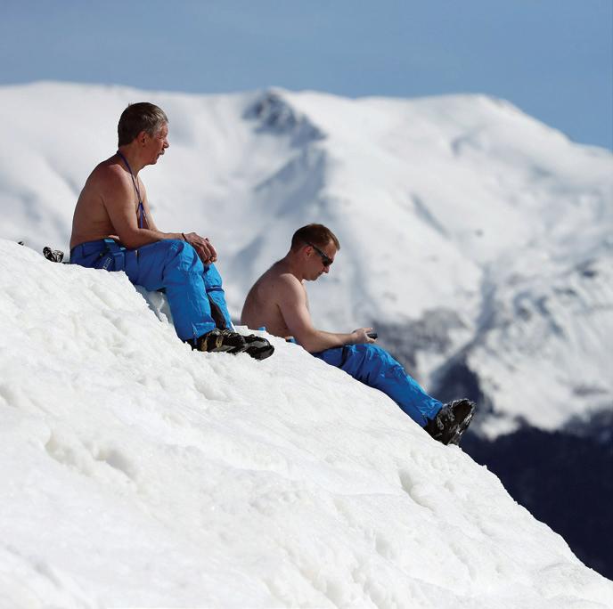 SOCHI 2014 Thirty-four years after the first usage of artificial snow for a Winter Olympics, the amount of man-made snow used for the Sochi, Russia Winter Olympics grew to around 80 percent. It was the third Games to use fake snow after Lake Placid and Vancouver. Sochi typically has around six days of snowfall, receiving less than three inches of snow. According to BBC, the amount of artificial snow could cover 1,000 football fields. Because of the concern of the lack of snow, thousands of pounds of snow were stored from the 2013 winter season. The photo depicts two workers at the Sochi Games with their shirts off on the mountains because of the warm, sunny weather.