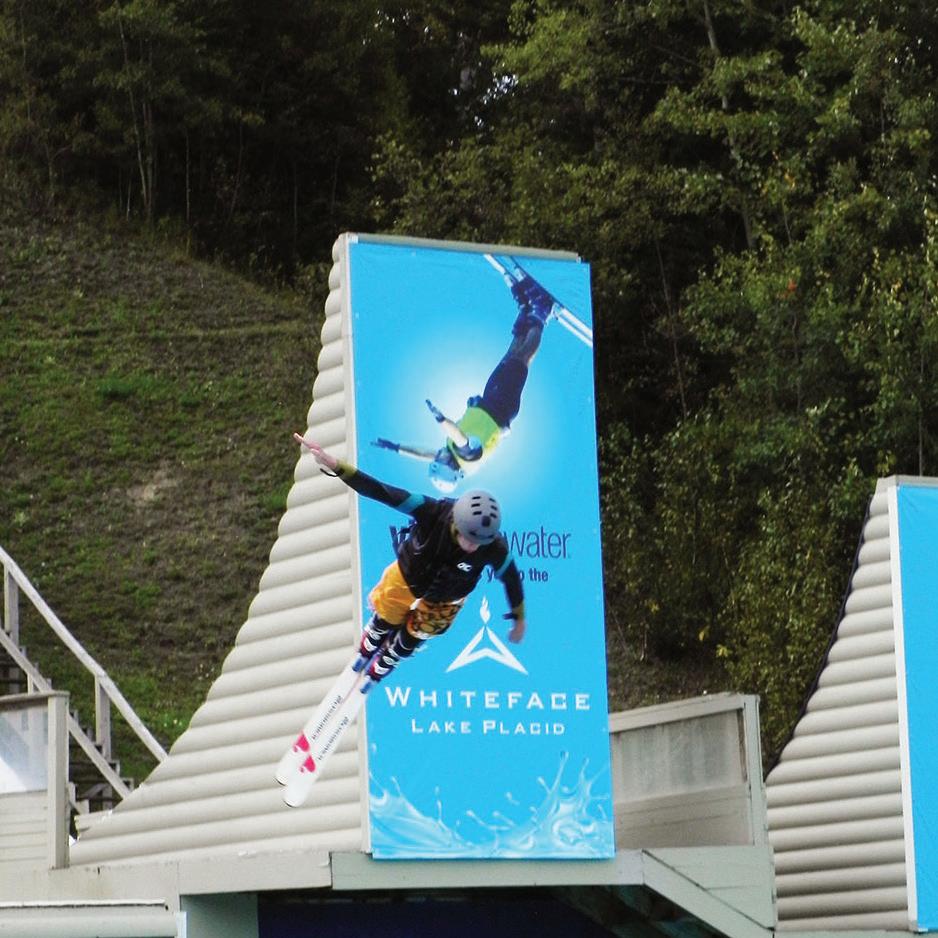 LAKE PLACID 1980 The first Winter Olympics to use artificial snow to accommodate for lack of snow took place in Lake Placid, New York in 1980. A month before the games, the mountains had yet to receive snow. That winter had been abnormally dry and warm, according to the Guinness World Records. However, just before the games started, there was a period of cold weather that supported the machine made snow. Lake Placid usually accumulates around 100 inches of snow, so the snow-less mountains during the 1980 Games were not typical. In the picture, a freestyle skier in Lake Placid flips off of a plastic ramp and lands in a swimming pool.