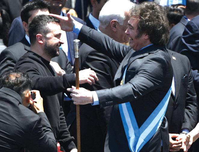 takes presidency President Javier Milei is greeted by Ukrainian President Volodymyr Zelensky after his Inaugural speech on Dec. 10.