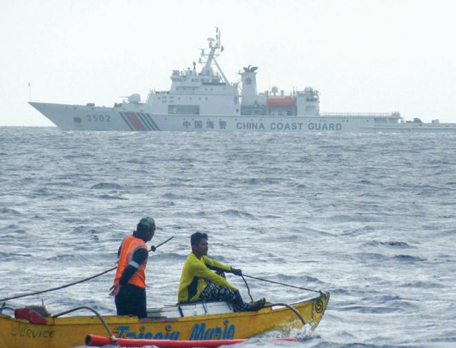 South China Sea conflict In this photo taken on December 23, 2022, Filipino fishermen aboard their wooden boat sail past a Chinese coast guard ship in Scarborough Shoal in the South China Sea. Photo by (STR/AFP via Getty Images/ TNS)
