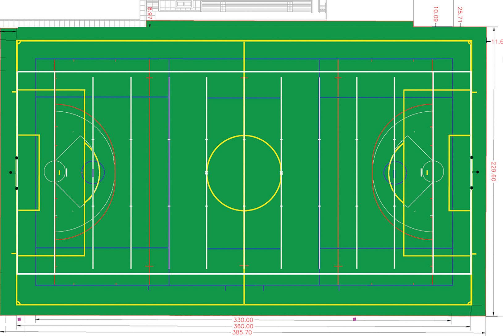 The Founders Field, currently a regular grass field, will be transformed into a larger turf field lined with every sports lines, rather than just one soccer line Turf field layout, sports indicated by color: Football: white