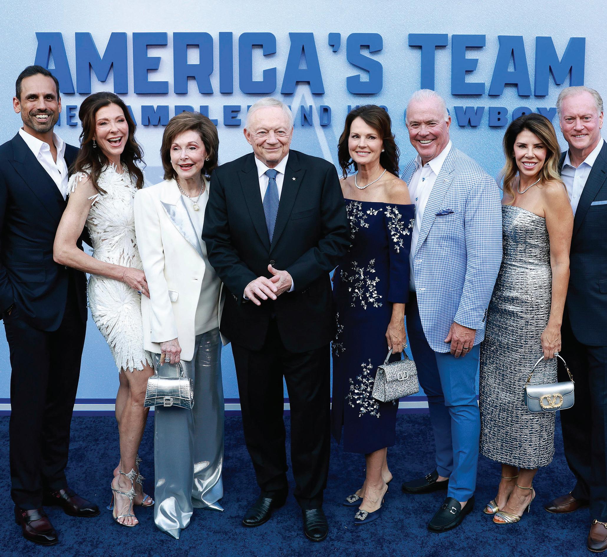 From left, Amir Rozwadowski, his wife Charlotte Jones, Gene Jones and her husband and Dallas Cowboys owner Jerry Jones, Karen Hickman and her husband Stephen Jones and Lori Lemon Jones and her husband Jerry Jones Jr. pose for photos on the blue carpet before the movie premiere of Netflix's "America's Team: The Gambler and His Cowboys" at the Egyptian Theatre in Los Angeles, California on Aug. 11, 2025.