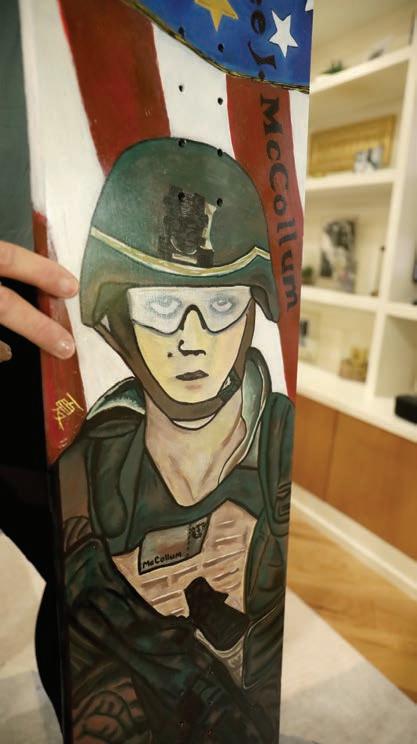 One poignant example of her work is a snowboard dedicated to Riley McCollum, a fallen Marine who was deeply connected to Summer’s son. “Riley and my son were in boot camp together,” Summer explains. “They helped each other, and Riley was one of the 13 who lost their lives in Afghanistan.” The snowboard, adorned with a painted photo of Riley and 13 stars representing the fallen, was given to Riley’s mother on the anniversary of his passing. “I just wanted to do something for his wife and child, especially since the parents often get forgotten,” Summer adds, her voice filled with empathy.