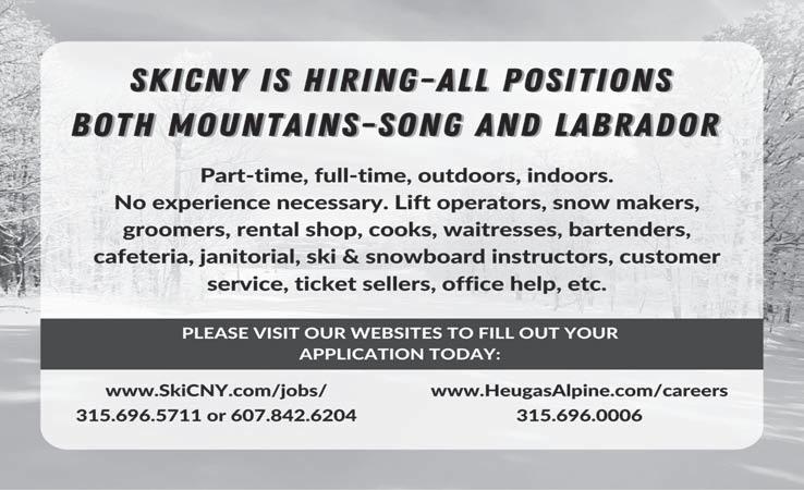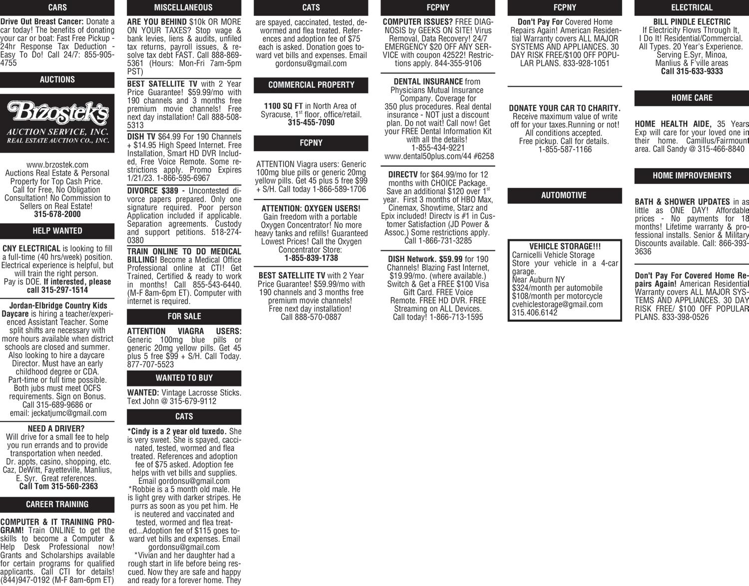 Jan. 11, 2023 7 eagle News CNY’s Community News Source PENNY SAVER BUSINESS SERVICE DIRECTORY Call Patti @ 315-434-8889, ext. 321 to get your ad in. Deadline: Wednesdays at 7pm. Call Us 437-6173 Need to Advertise it? HAVING A GARAGE SALE?44585_5 GENERAL/ CLASSIFIEDS Visit our self-service site at www.theclassifiedsuperstore.com or call 315-434-8889, ext. 321. Deadline: Wednesdays at 7pm.
